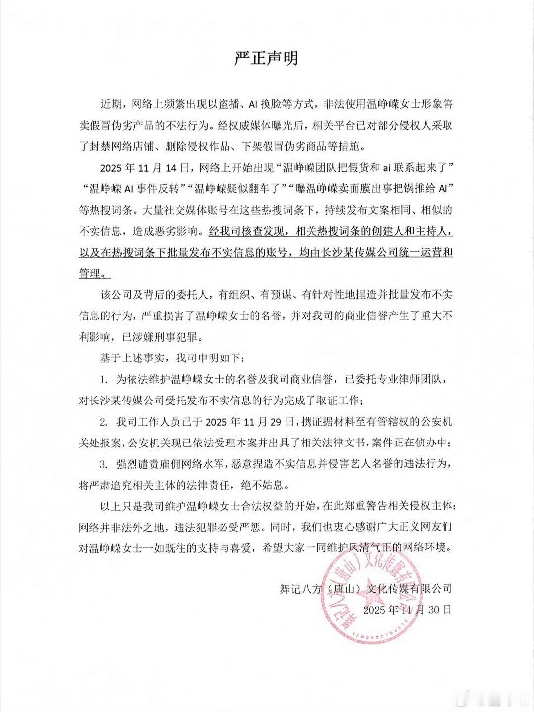 温峥嵘称已报警立案温峥嵘 AI盗播12月1日,温峥嵘发博称对于“AI盗播”事件已报警立案。此前温峥嵘在采访中提及遭AI技术合成的“自己”正在直播,她点进直播间问“你是温峥嵘我是谁”被拉黑。后续以“温峥嵘团队把假货和AI联系起来了”进行抹黑,温峥嵘方已委托律师团队完成取证并已报案。温峥嵘报警立案追究AI盗播责任温峥嵘遭AI盗播及不实抹黑报案