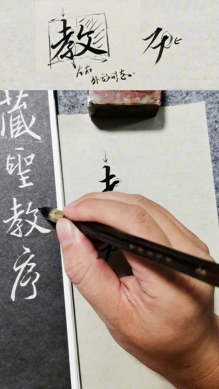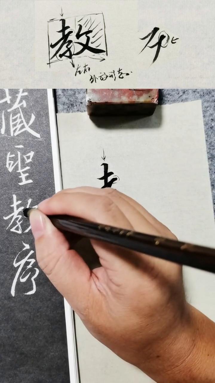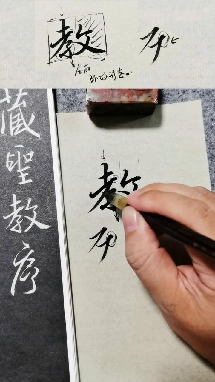 这节课我们来讲教字的写法,看怎么写教字。 ·写之前先观察一下这个字,右边是上面这部分稍微低一些,最高的位置在这里,右边稍微往低一点点。 ·捺画笔画是比较重的,比较粗的,也往外面比很多,这样很斜,斜下来往外面画一个外轮廓,是这样子的,它是一个很往外面很放。 ·这边就是一个字的式,这边收一些,左边这边相对要收一些,右边的时候要放出来。 ·写的时候就把握一下大的方向,以后再去看一下里面的细节就怎么写。比如里面有几个竖画,一个竖画,两个竖画。第一个竖画写的稍微直一些,往下直一点,到下面直的弯钩就稍微是往右下斜的这种感觉,所以写的时候也要支撑,其实就是一个上下结构。 ·左边就是个上下结构,特别上面的部分,下面一部分两个竖画都不是,两个是都是一样纸的,一个是弦,这个是斜的,有弦,所以一定要注意。 ·先写一下横画,横来写竖画,这边有一个收,为什么收?收过来要写横画,u 笔,这边横和撇是连在一起的,有一点往上翻笔,往下翻笔完之后往下走,下面这个纸横,斜的压笔提上去,这个是直的,这个就是有点斜,往右下斜,就这个地方了,横折,横撇这个地方感觉是有点稍微往上翻笔下来的。 ·写的时候也可以写,有些是可以直接写压笔就直接翻过来,这个有点就是往上翻笔下来这种感觉。右边这个就是稍稍的连接,这个地方还是比较难写的,先注意一下,起笔的位置要稍微低一些,大概就在这个位置,起笔,现在压笔往上走,这里回来连起来,撇也就那画很重,出放出去。 ·右边写的稍微感觉宽了一点点,这边空间会比较大,整个字就是这边放一些,这边笔画比较多一些,就显得稍微密一点点,一个是密的,一个是书的两个书密的对比,下面基本上就是一个平的,下面基本上是平的。 ·注意这种字也是一样,就把万能扣给画一下,万能画一下,整个字这边的空间也是很大,整个字就是左边这部分,左右结构是左边这部分显得稍微收一些,右边就成外放的这种状态。