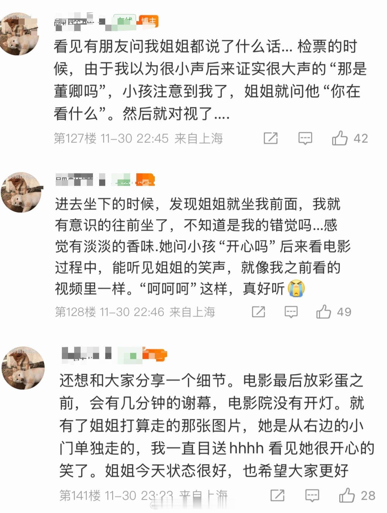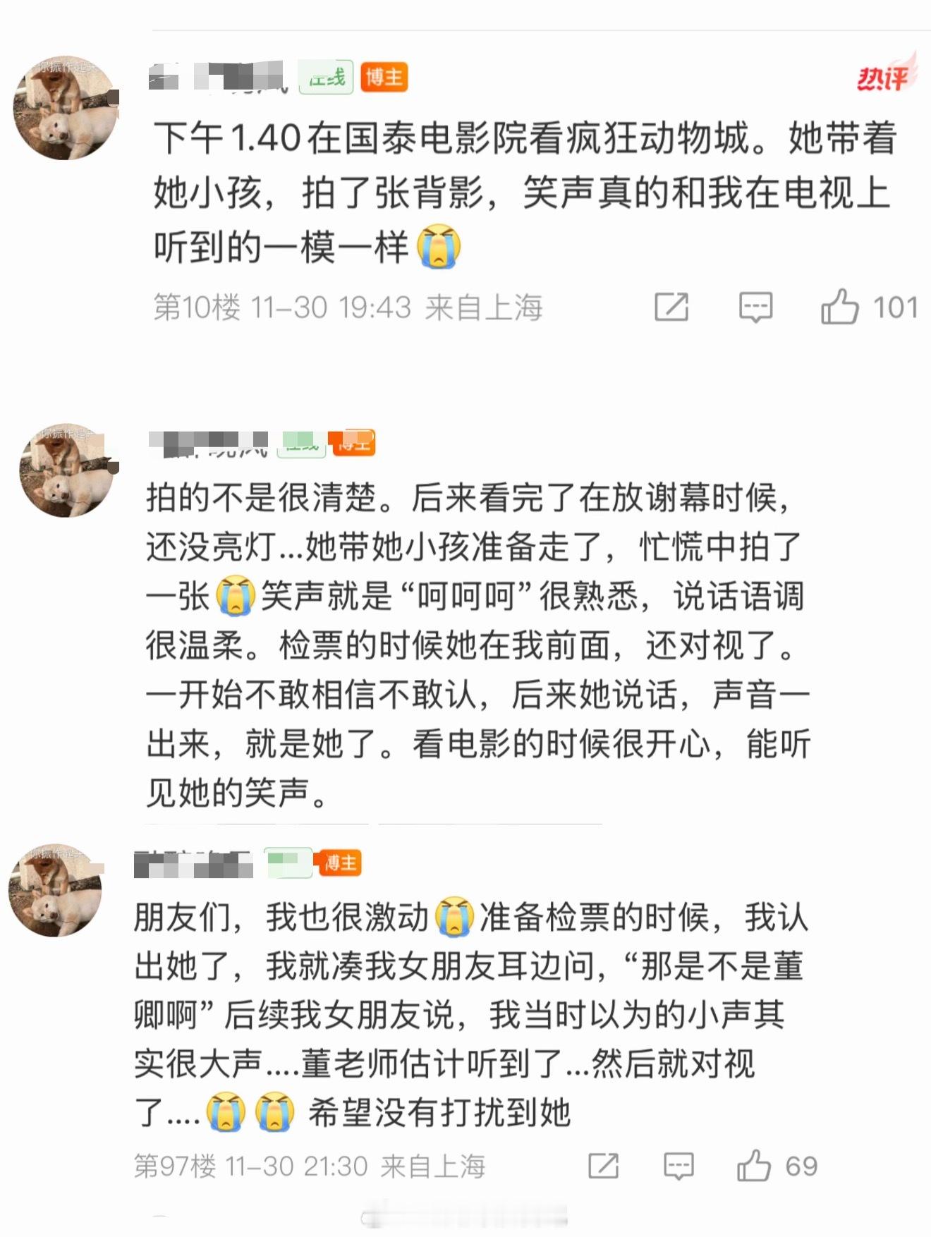 偶遇董卿看疯狂动物城有网友偶遇董卿来看疯狂动物城了!说董卿身上有淡淡的香味,声音就和之前视频里听到的一样,好像看的很开心,能听到她的笑声人果然还是要多出门啊,什么时候我才能遇到董卿!!!