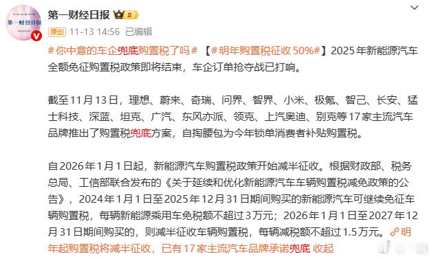 还有最后一个月,新能源购置税免税政策就要结束了!目前已经有十多家车企开启了新能源购置税兜底方案你会抓紧最后时刻入手新能源车吗??明年购置税征收50%