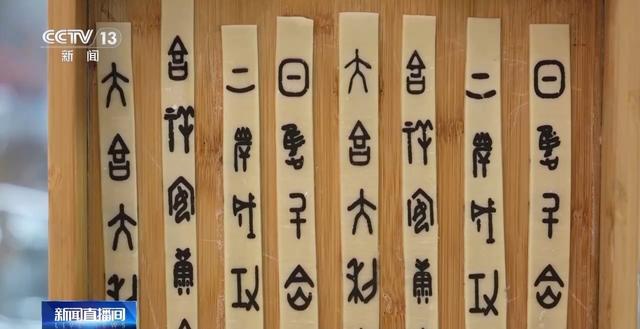 殷墟博物馆子飨餐厅负责人马豪:面条做成会压印,压完之后会人工往上刷墨鱼汁。我们选用的是四个不同的甲骨文字(词句),分别是大吉大利、吉祥安康、上岸成功和日进斗金,这样满足不同客群的不同的需要。