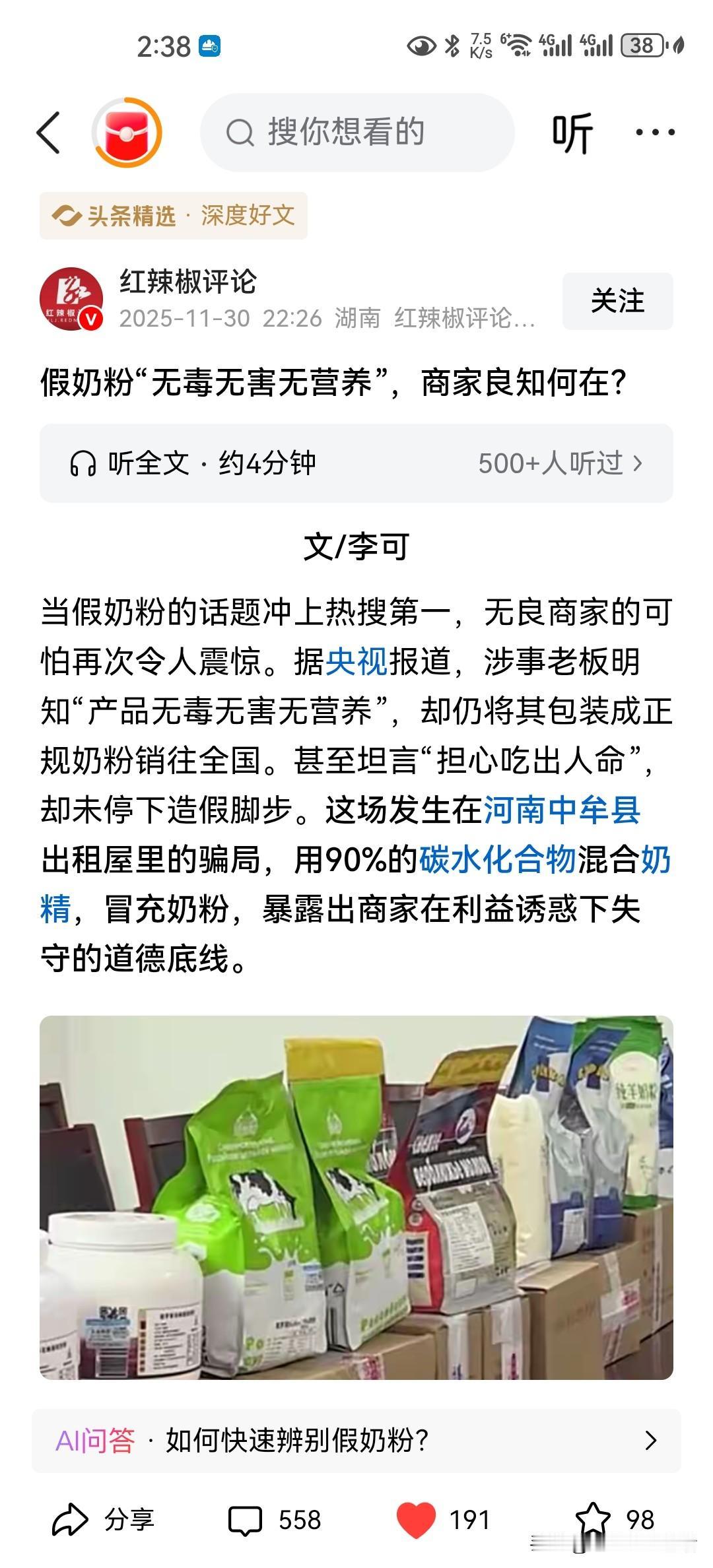 当年“大头娃娃”的阴影还没有走出来。 河南又惊现假奶粉! 本来想花钱买点营养品来补充,没想到却成了不法分子的赚钱法宝,却给了他们投机倒把的机会。 在不远的2003年,安徽的阜阳地区出现很多因为喝到假冒伪劣的奶粉,导致171个儿童出现营养不良,最可恶的是让13个本该健康成长的小朋友,因为黑心老板而丧命,如果他们现在还健在,如今也到了娶妻生子的年纪了。 没想到当年那批孩子躲过了“大头娃娃”的毒奶粉,却又遇上了河南的假奶粉,真应了那一句躲过了初一,没躲过十五啊! 不过这次不但盯上了当年逃过一劫的孩子,还盯上当年孩子的父母,现在的孩子的爷爷奶奶,一批需要和奶粉补充营养的老人和孩子。 长期食用这些只有奶精,没有营养的碳水假奶粉,后果可想而知,只能导致生长停止,免疫力下降,从而身体越来越虚弱,引发更多的疾病! 这些黑心老板,不只是漠视法律,更是严重的道德沦丧,必须严惩,处罚也要顶格处理,这些假奶粉和慢性毒药没有多少区别了! 你们在生活中遇到过假奶粉吗? 反正给动物买的奶粉,经常买到假货,最后导致花高价,也救不回心爱的宠物,只是这次换成了人。 黑心奶粉 儿童奶粉骗局