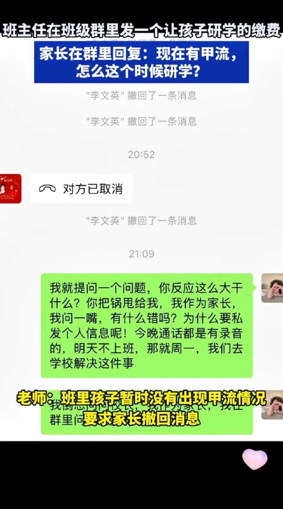 班主任在班级群里发了一个让孩子研学缴费的通知,家长在群里面回复:现在有甲流,怎么