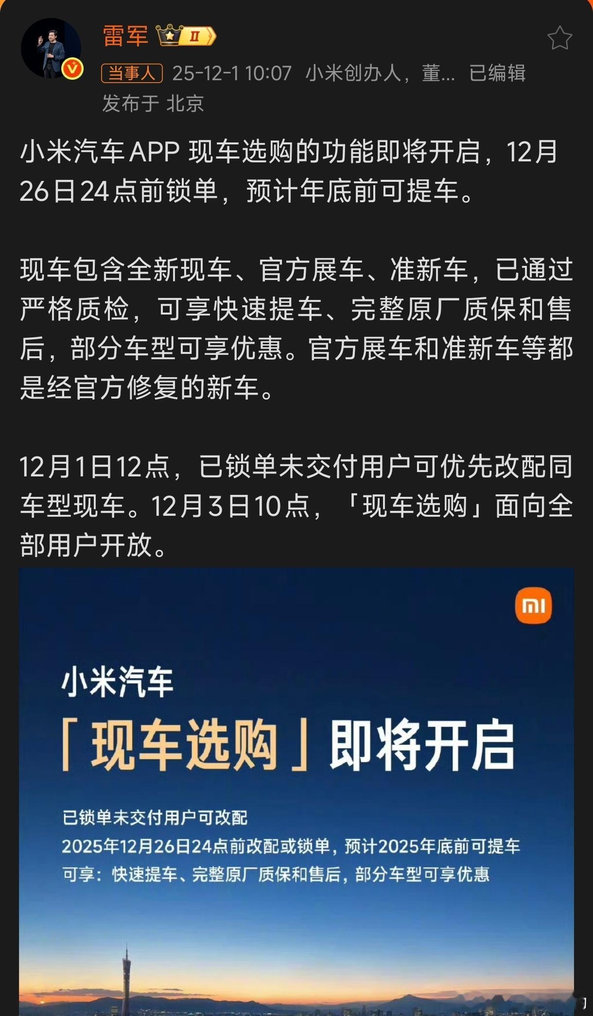 小米汽车开启“现车选购”。有网友就纳闷了,小米汽车不是供不应求那,人家下定车主提