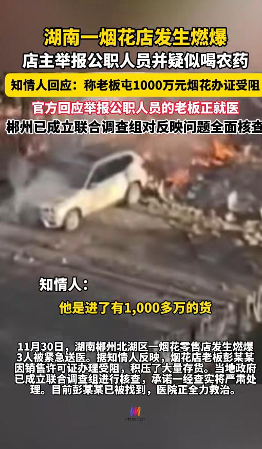 郴州烟花店老板举报公职人员后喝农药,知情人爆原因…… 12月1日,湖南郴州联合调查组发布情况通报,称烟花店老板举报公职人员违规违纪后并喝农药。 当地高度重视,已经成立联合调查组全面调查核实,如果查实就会严肃问责。 另外烟花店老板正在医院抢救! 那么,很多人会疑问,烟花店老板举报的原因是什么? 据齐鲁晚报采访了知情人,据知情人透露,烟花店老板彭某某从事的是烟花行业。 该知情人表示,彭某某屯了近1000万的烟花,打算开一个烟花零售店,但是去申请烟花销售许可证的时候一直被卡了,办不下来。 而彭某某是孤注一掷的,如今钱花了,烟花屯了,但没烟花销售许可证,没办法只能实名举报公职人员。 没有后文,彭某某就将放烟花的房子给炸了,也喝了农药。 据郴州应急管理局通报,11月30日上午,一烟花零售店发生燃爆,事发造成了3人受伤。 其中一人是老板,该通报表示,3人已经及时送往医院治疗了,事故还在调查之中。 综合知情人爆料,爆炸的烟花店应该也与举报人彭某某有关,而彭某某目前怎么样。 据媒体报道,“敌草快”是一种剧毒的除草剂,目前并没有特效解药。 但是“用命举报”的举措,实在是不可取,好死不如赖活着,不管遇到什么问题,活着才有希望。 如今烟花摊主钱花了,烟花也被炸没了,人还在救治,害了他自己,也给他家里增加了负担…… 该新闻后续真相,我们静待官方通报。