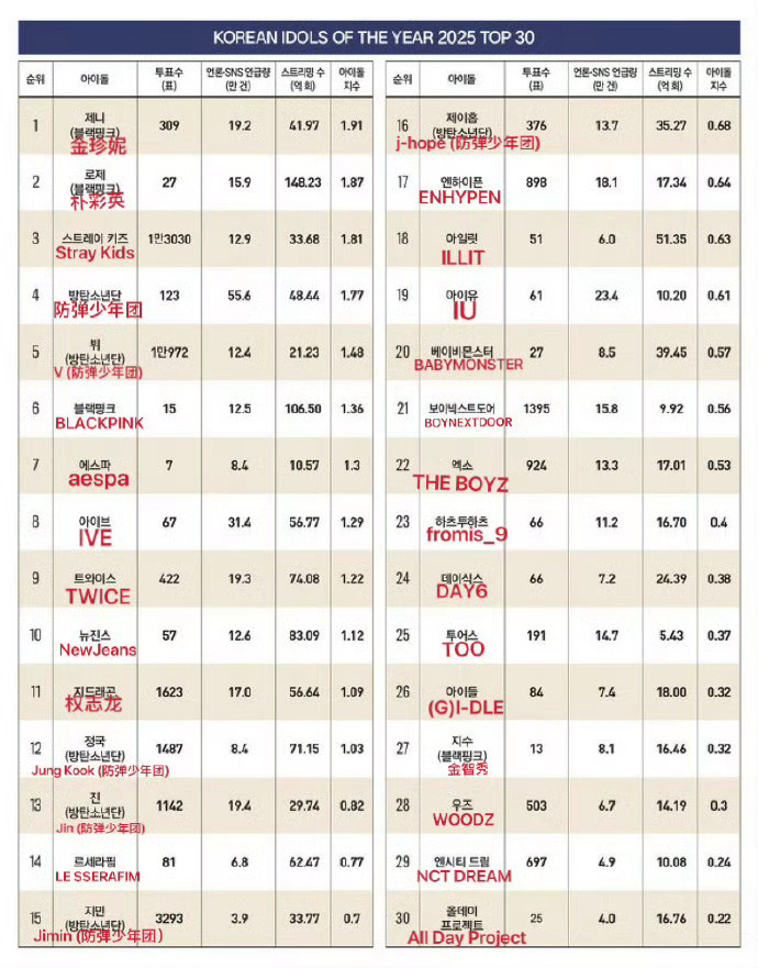 jennie韩国福布斯年度爱豆第一福布斯韩国日前公布2025年度偶像排行榜TOP30,BLACKPINK成员Jennie登顶个人榜榜首。该榜单综合评估艺人的专辑销量、媒体曝光、商业价值及社会影响力等多维数据。