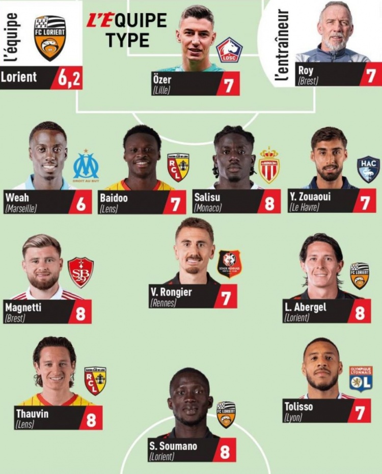 中场:马格内蒂(布雷斯特)、隆吉耶(雷恩)、阿贝热尔(洛里昂)
