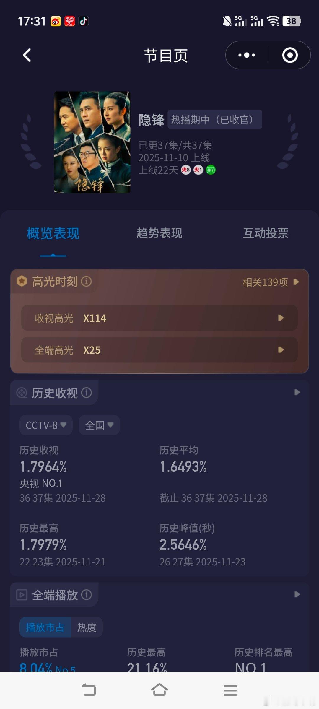 杜淳、颖儿《隐锋》收官战报!这个收视比好多黄金档收视率都高酷云集均:1.6493CVB集均:1.578电视剧隐锋