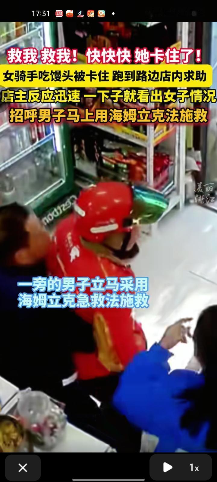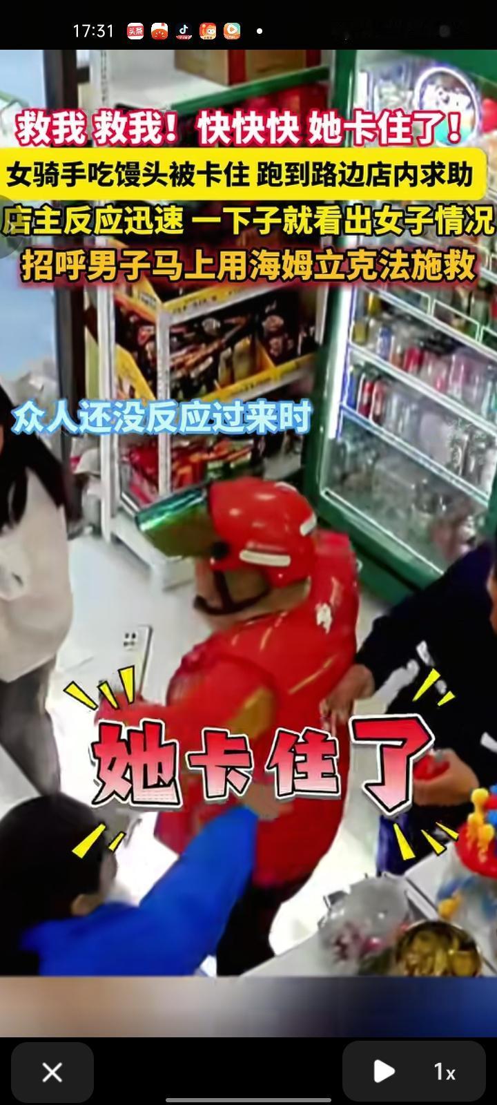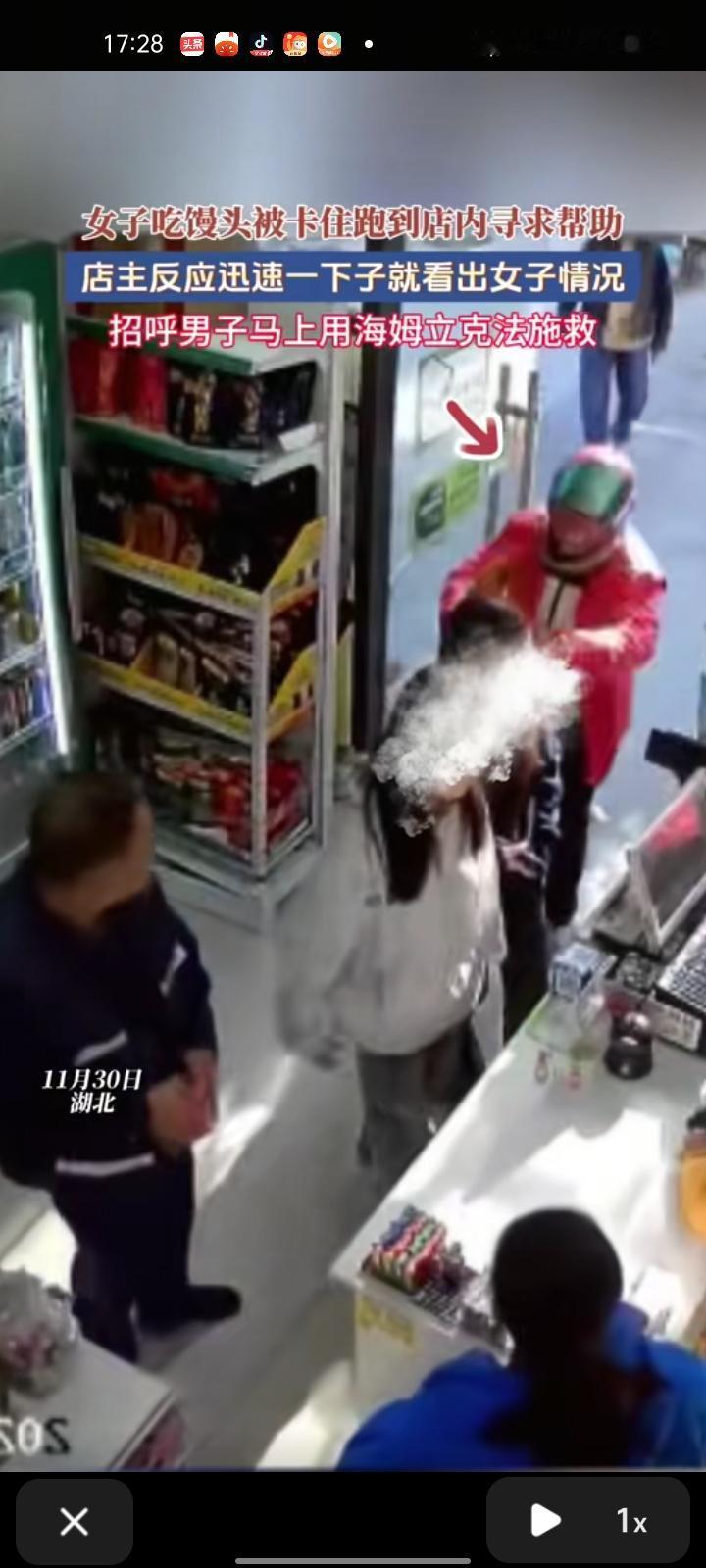 11月30日,黄冈市红安县。女子吃馒头被卡住,跑到路边店内求助,店主反应迅速,一下查出女子的状况,随后男子采用海姆立克法施救,女子嘴里的异物吐出来了。