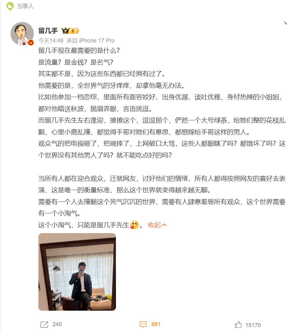 留几手回应葛夕加盟恋综【葛夕加盟恋综,告别“苦情前妻”人设,前夫留几手发文疑似暗指前妻】葛夕回应参加恋综葛夕官宣加盟恋爱综艺《在恋爱开始之前》,并表示要摆脱“苦情前妻”形象,开启新恋情。同日,前夫留几手发布长文,称自己不需要流量、金钱或名气,真正需要的是“让全世界气得牙痒痒却拿他毫无办法”,幻想自己参加恋综被众多优秀女性追捧,被网友普遍解读为对葛夕上恋综的隔空回应。尽管未提葛夕姓名,但时间点和语境高度关联,引发热议,被戏称为“破防现场。