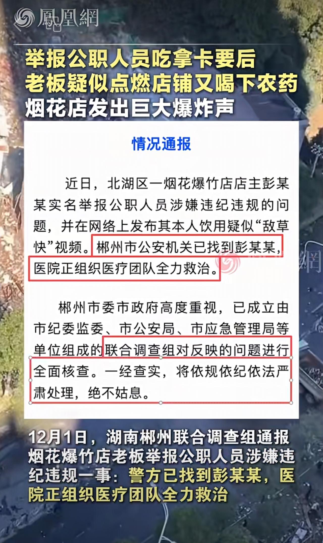 郴州烟花店老板举报公职人员后喝农药,知情人爆原因……12月1日,湖南郴州联合
