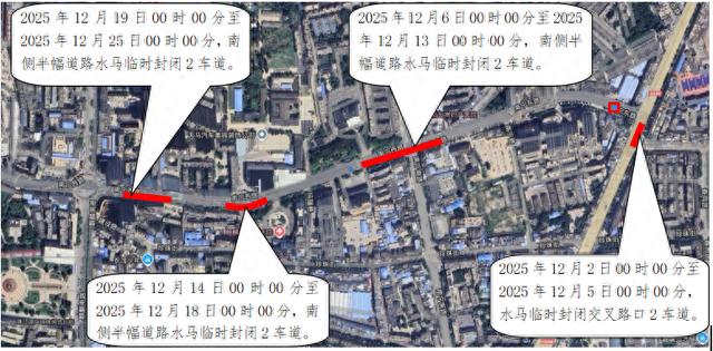 根据曲靖中心城区水环境治理工程施工安排,将于2025年12月2日00时00分至2025年12月25日00时00分,对南宁东、西路(麒麟南路至紫云南路段)部分路段进行施工,期间南宁东、西路南侧半幅道路设置水马临时封闭2条机动车道,保留非机动车道及1条机动车道通行。施工路段车道减少,请途经车辆提前规划出行路线,过往车辆、行人根据交通指示牌提示通行,自觉遵守交通引导,服从现场人员指挥,安全有序通行。