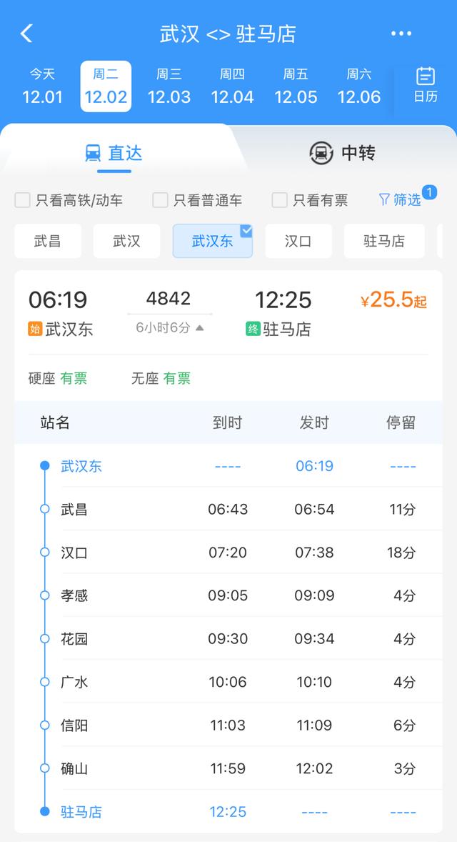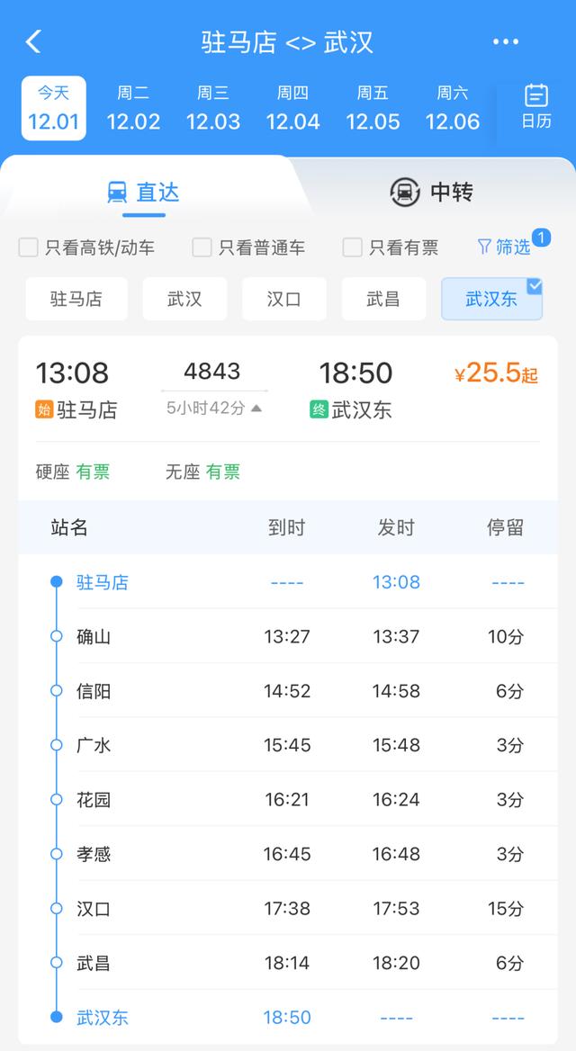 铁路12306App显示,该趟列车票价仅25.5元。其中,武汉东站4842列车6:19始发,经停武昌、汉口、孝感、花园、广水、信阳、确山等7站,12:25抵达驻马店。驻马店4843列车13:08始发,经停确山、信阳、广水、花园、孝感、汉口、武昌等7站,18:50抵达武汉东。