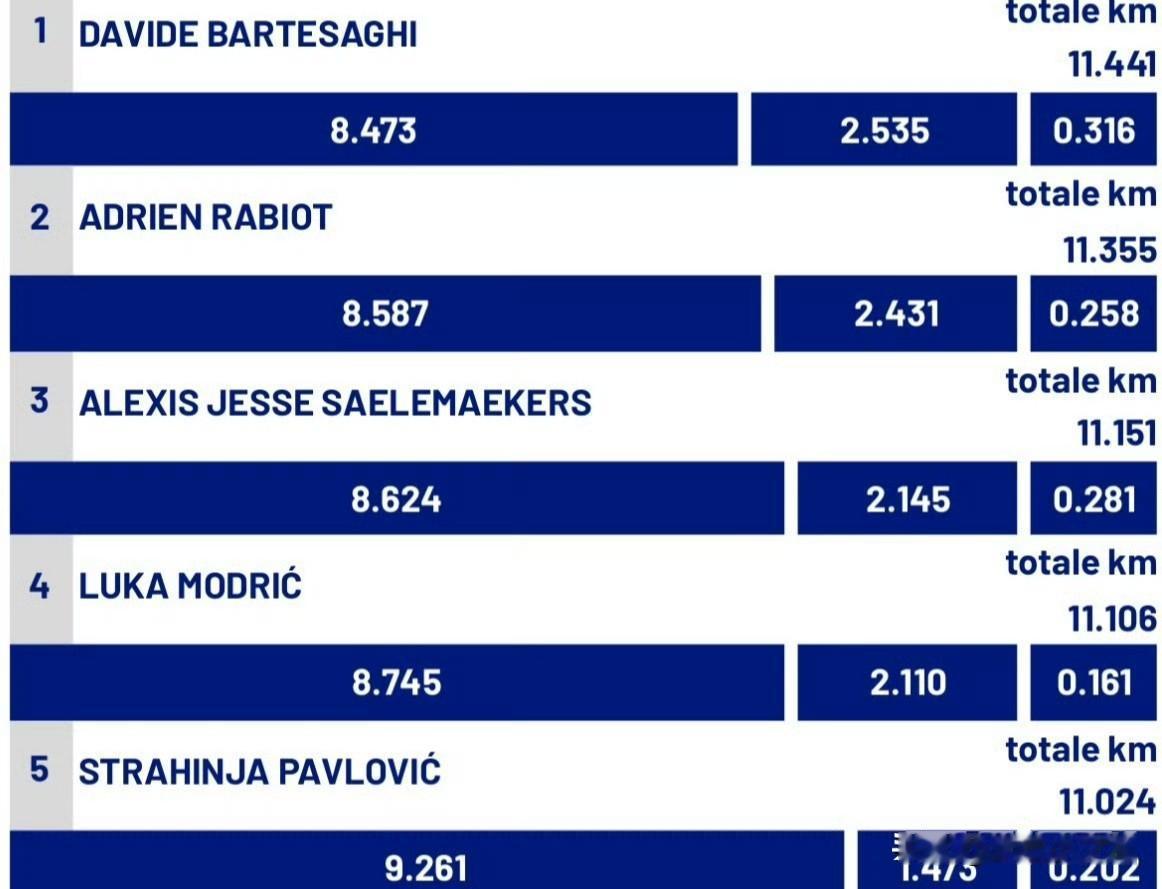 米兰与拉齐奥之战全队跑动前五的球员,巴特萨吉第一,莫德里奇依然保持场均11公里的跑动。 我们单线作战,几位中场球员这样跑问题不大,但真的到了明年三线作战时候,中场球员这样跑也不是办法,小英雄拉比奥特年龄也不小了,萨勒马克尔斯身体也不是很抗造的,总是小伤不断,还是要提前准备,未雨绸缪,提前去准备好轮换阵容,现在我们基本就没有几位可以轮换的球员。 有时想想,现在的阵容,留给阿莱格里调整的空间,真的很小。其实调整主要还是调整进攻,往往防线上的替补,到后面尤其是只领先1球需要苟住的时候,很难说把替补换上去。咱们中场福法纳状态不佳,但没有替补,福法纳作为牛马就没有替补,想调整都没办法调整,萨勒马克尔斯替补是阿泰卡梅,不说位置,现在还孩子伤病了,拉比奥特按说有替补,加沙里完全可以,但加沙里貌似状态还是不佳,阿莱格里不敢冒险使用,阿莱格里确实是没有人可用。