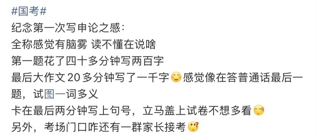 国考众生相:从“脑雾”到“沉默”,一场考试看尽人生百态 今年的国考现场,堪称大型“人类迷惑行为”现场!考生们考后纷纷开启吐槽模式:有人形容自己宛如患上“脑雾”,题目在眼前飘就是抓不住;有人从上午被考到“沉默”,直到下午还沉浸在震惊中无法自拔;更有勇者直言申论考场“拉了坨大的”,这画面感瞬间拉满! 考场如镜,照见人生百态。行测的烧脑谜题与申论的深度思辨,让不少考生直呼“麻了”。但正是这些哭笑不得的瞬间,构成了我们共同的成长记忆——那些抓耳挠腮的焦急,文思枯竭的窘迫,不正是为梦想拼搏的鲜活印记吗? 今年的国考,你经历了哪些“难忘瞬间”?是行测的奇葩题目,还是申论的绝地求生?欢迎在评论区分享你的故事。 国考进行时 公考人的日常 上岸路上不孤单