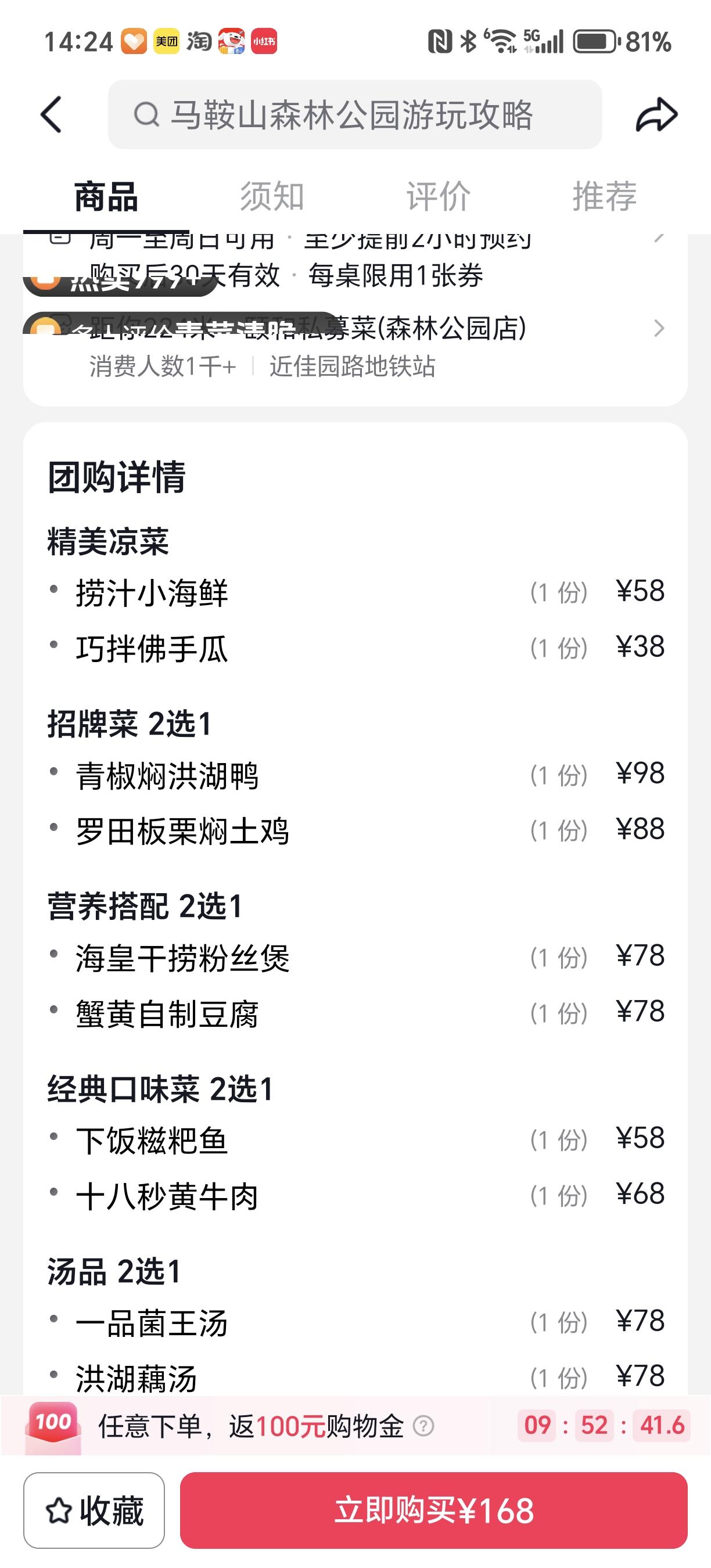 周日的晚餐,我们在森林公园门口的颐和私募菜吃的。 凉菜有捞汁小海鲜,巧拌佛手瓜(这个菜太下饭了,我们不吃主食,这个菜让服务员端下去了)。捞汁小海鲜里有很小很小的鲍鱼,两只虾,还有一些贝壳类的,下面是黄瓜拍碎了打底,味道还行。 招牌菜二选一, 青椒焖洪湖鸭,罗田板栗焖土鸡。女儿喜欢吃板栗烧鸡,但服务员说这个菜没有了,板栗的季节已经过了,所以只有青椒焖洪湖鸭。这道菜分量不小,还是最后上的女儿吃了几块鸭,我们都快吃饱了,没怎么动,最后打包回家,发现下面垫了一些炖得很烂的萝卜,味道也还不错。 营养搭配二选一,海皇干捞粉丝煲和蟹黄自制豆腐,上次吃过这个豆腐,这次就换个粉丝煲吃。这道菜分量也很多,粉丝很入味,里面有一些鱿鱼碎、虾仁等等 ,这个菜没吃完,我们也打包回来了。 经典口味菜二选一,下饭糍粑鱼和18秒黄牛肉,那我们当然是选牛肉,牛肉比鱼贵呀。上来一盆红彤彤的辣椒炒牛肉, 点缀了一些绿色的香菜,算是色香味俱全,就是辣椒太多,肉太少。 这道菜里面的肉我们都吃完了,还剩下很多辣椒,没有打包。 汤品二选一,一品菌王汤和红胡藕汤。我们点的洪湖藕汤,藕特别粉糯,也没吃完,打包回来了。 三个打包盒花了6块钱,下次再吃这个套餐,就自己带三个盒子去。 这个地方环境不错,服务也还行 主要是离家近,如果多出点菜品不同的三人套餐,两人套餐,那我们应该会经常去,但估计这样的套餐餐厅不怎么挣钱,只能引流,也不会出太多。