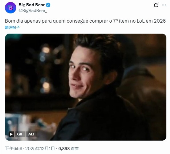 直播吧12月1日讯巴西老哥发布动态:早安只属于那些在2026年能成功购买到《英雄联盟》第七件装备的人。