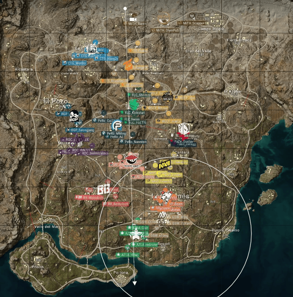 梅花桩,T5打掉TL独狼,AZLA打掉PeRo一人,随后T5带走AZLA残编,随后打掉PeRo三人,完成吃鸡。