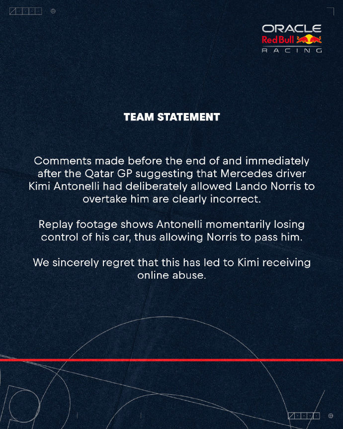 声明写道:“在卡塔尔大奖赛结束前及结束后立即发表的言论,暗示梅赛德斯车手基米-安东内利故意让兰多-诺里斯超越他,显然是错误的。
