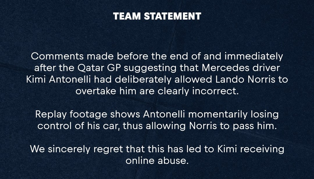 卡塔尔大奖赛结束前与赛后,车队的所有有关“安东内利让过了诺里斯”的言论是不正确的。