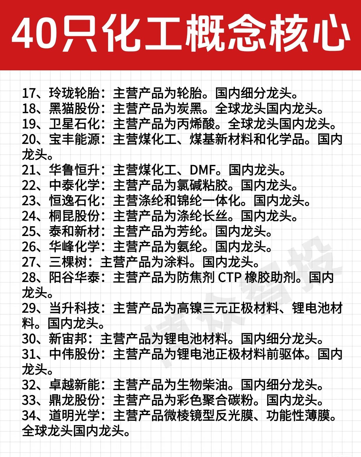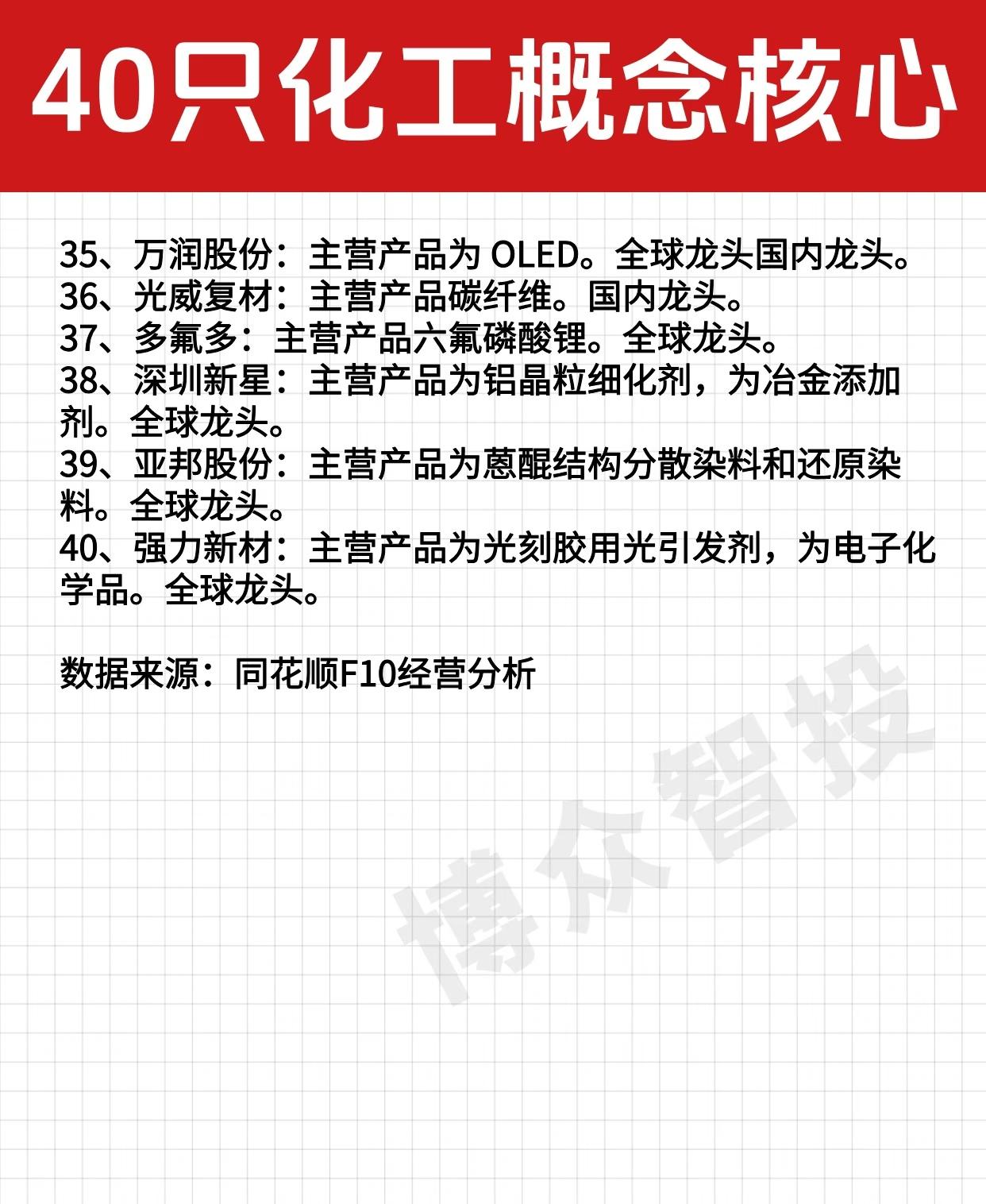 40只化工概念核心股票: 万华化学主营MDI、TDI,为全球和国内龙头;恒力石化主营传统炼化,是国内民营龙头;荣盛石化主营聚酯纤维,为国内龙头;浙江龙盛主营分散染料、活性染料,为全球龙头;龙蟒佰利主营钛白粉,为全球及国内龙头;巨化股份主营第三代氟制冷剂,为全球及国内龙头;安迪苏主营蛋氨酸(动物营养添加剂),为全球及国内龙头;扬农化工主营农药菊酯,为国内龙头;新洋丰主营复合肥(农资必需消费品),为国内龙头;金禾实业主营甜味剂(安赛蜜、三氯蔗糖,食品添加剂),单寡头垄断且为全球龙头;红太阳主营农药吡啶碱,为全球龙头;兴发集团主营草甘膦、磷矿石,为国内龙头;利尔化学主营草铵膦,为国内龙头;恩捷股份主营锂电池湿法隔膜,为全球龙头;国瓷材料主营电子陶瓷MLCC配方粉,为全球及国内龙头;青松股份主营合成樟脑,为全球龙头。 玲珑轮胎主营轮胎,为国内细分龙头;黑猫股份主营炭黑,为全球及国内龙头;卫星石化主营丙烯酸,为全球及国内龙头;宝丰能源主营煤化工、煤基新材料和化学品,为国内龙头;华鲁恒升主营煤化工、DMF,为国内龙头;中泰化学主营氯碱粘胶,为国内龙头;恒逸石化主营涤纶和锦纶一体化,为国内龙头;桐昆股份主营涤纶长丝,为国内龙头;泰和新材主营芳纶,为国内龙头;华峰化学主营氨纶,为国内龙头;三棵树主营涂料,为国内龙头;阳谷华泰主营防焦剂CTP橡胶助剂,为国内龙头;当升科技主营高镍三元正极材料、锂电池材料,为国内龙头;新宙邦主营锂电池材料,为国内细分龙头;中伟股份主营锂电池正极材料前驱体,为国内龙头;卓越新能主营生物柴油,为国内细分龙头;鼎龙股份主营彩色聚合碳粉,为国内龙头;道明光学主营微棱镜型反光膜、功能性薄膜,为全球及国内龙头。 万润股份主营OLED,为全球及国内龙头;光威复材主营碳纤维,为国内龙头;多氟多主营六氟磷酸锂,为全球龙头;深圳新星主营铝晶粒细化剂(冶金添加剂),为全球龙头;亚邦股份主营蒽醌结构分散染料和还原染料,为全球龙头;强力新材主营光刻胶用光引发剂(电子化学品),为全球龙头。