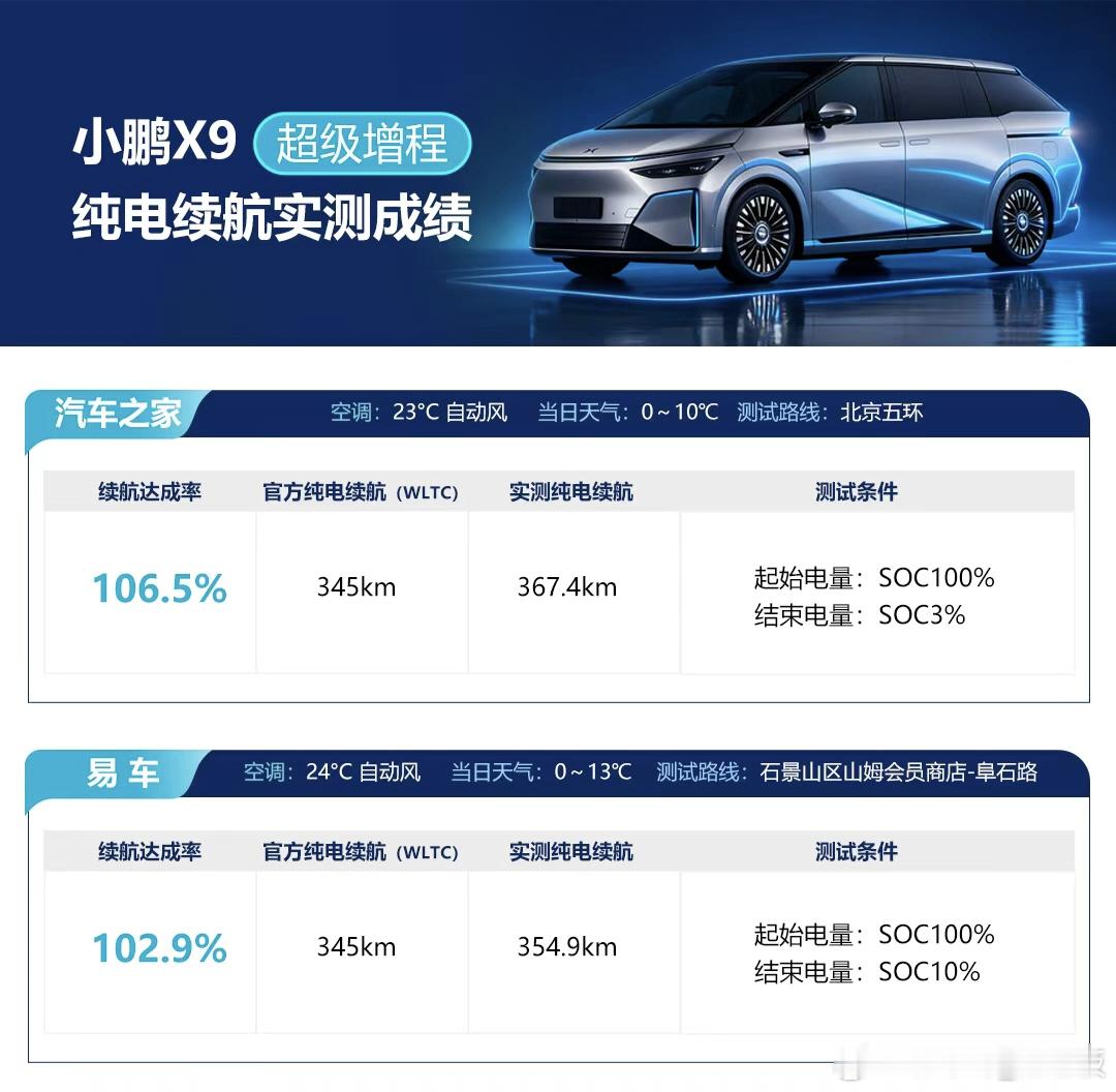 小鹏X9“反向虚标”实锤!最新实测数据显示,小鹏X9超级增程版的纯电续航表现超出官方标定,实现真正的“反向虚标”!汽车之家实测纯电续航达到367.4km,而易车的测试结果也高达354.9km,两者均超过工信部标称的WLTC 345km续航里程。两大垂媒实测小鹏X9续航反向虚标