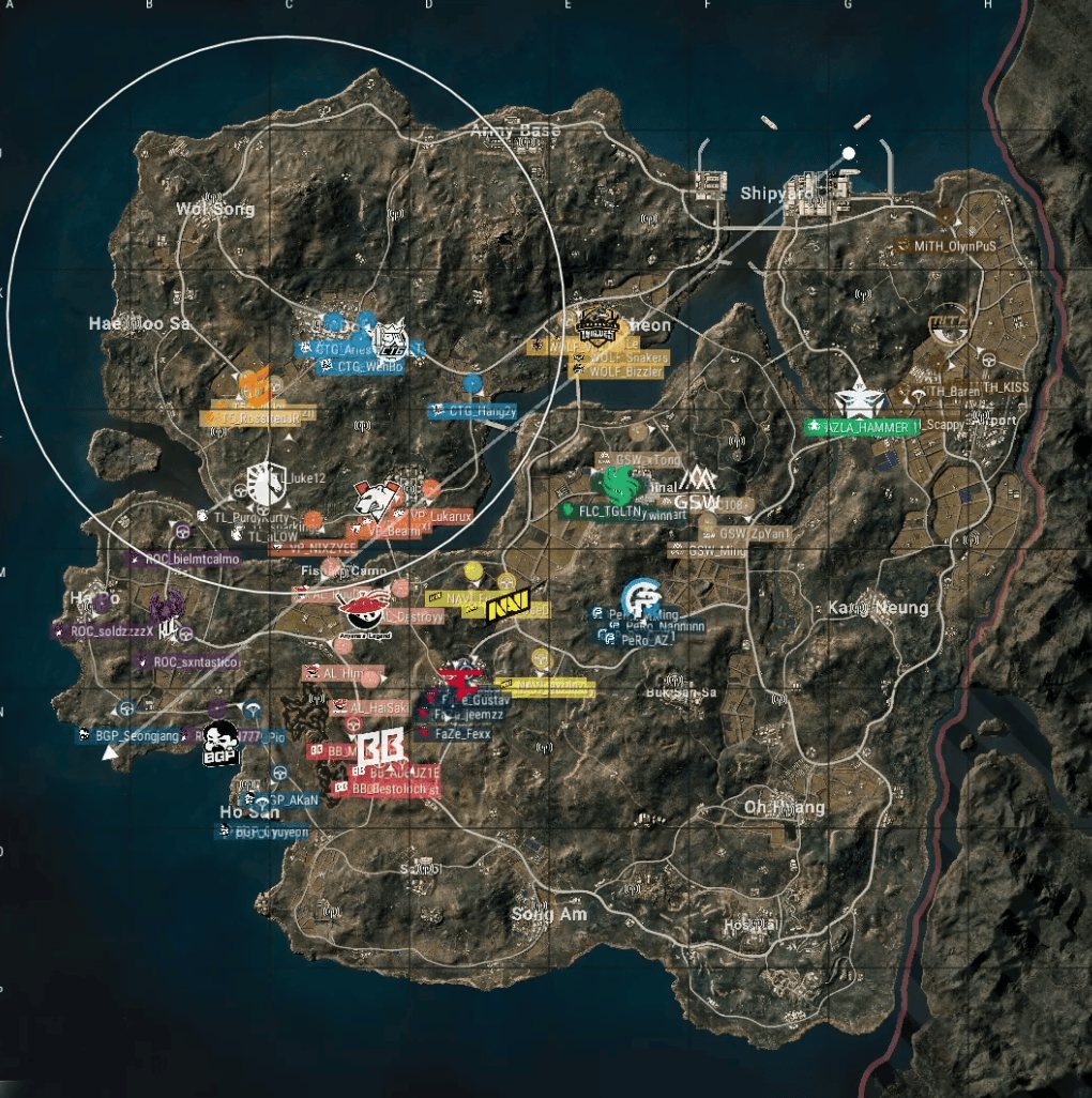 阶段7剩余5队,ROC与FLC在圈型北侧小庙交火,两队互有倒地。