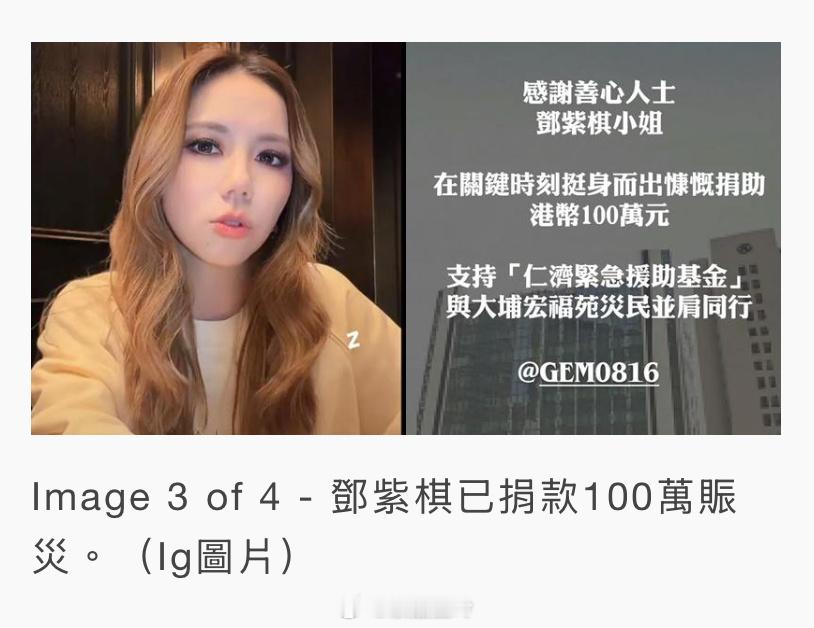 【明報即時】大埔宏福苑五級火|鄧紫棋廣西開騷淚灑舞台 郭富城捐100萬賑災 鄧紫棋前晚在廣西南寧開騷,其間心繫大埔災情,禁不住淚灑舞台。(threads影片截圖)大埔宏福苑上周三發生五級大火,截至今天(1日)下午4時,死亡人數增至151名,火災造成重大傷亡,震驚全球,鄧紫棋(G.E.M.)身在廣西南寧舉行世界巡迴演唱會,但她仍心繫香港,並捐出100萬港元賑災,而前晚(11月29日)G.E.M.因心痛香港災情而淚灑舞台。演唱會甫開場,鄧紫棋已泛淚說:「我沒想到我今(前)天的情緒來得這麼快。」當問到大家「這2年過得好不好」時,她已按捺不住情緒,為盡快平復心情,她在演出開始時先說出心底話。G.E.M.接着聲音顫抖哽咽地說:「這幾天...對於香港,是一個非常難過的日子,我不知道大家有多少人留意到新聞。」台下歌迷見狀,立即大叫「不要哭」、「加油」。G.E.M.輕輕拭淚後再說:「我看到新聞的時候,我會覺得,每一天在這個地球上,真的都發生很多事情,但是,我們在這樣的時代,把『I AM GLORIA』這個巡演帶來,就是希望能夠帶給大家力量。」鄧紫棋直言自己能做的或許不多,希望透過音樂為大家生活帶來力量,並鼓勵所有正在面對困難的人:「無論是真正在面對目前災難的朋友,還是每一個人在你們的人生當中,面對著屬於你們自己的難處、你們的困難,我真的只想要知道,你們正在努力地、積極地、好好地活著。」另外,身為保良局永恆愛心之星的郭富城,亦透過郭富城國際關愛慈善基金,捐出港幣 1,000,000元予「保良局扶弱基金 - 支援宏福苑火災居民專項戶口」,支援今次火災救援及災後重建工作。(即時娛樂)
