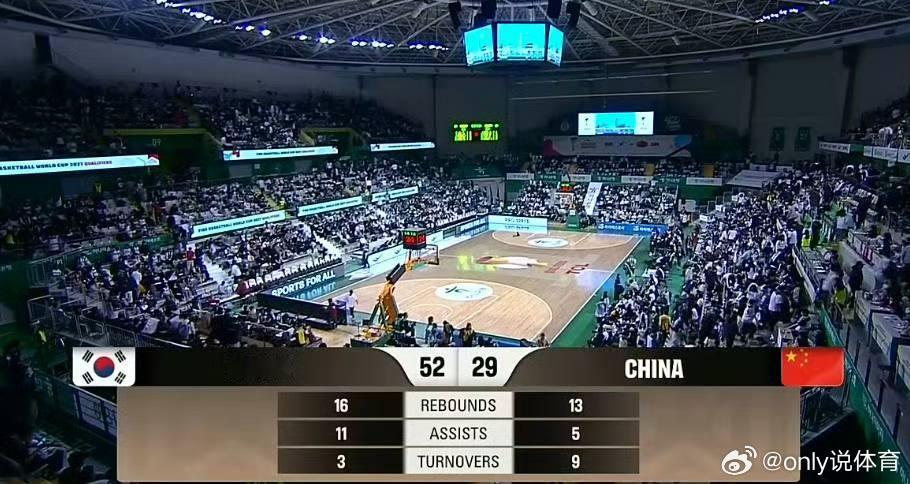 中国男篮半场仅得29分,落后韩国23分,韩国的压哨三分堪称是杀人诛心。韩国半场三分7/10,我们是1/12;韩国3个失误,我们9失误;他们都知道挡拆打一些错位,我们感觉进攻已经凝固了,只有无尽的强攻无果。中国男篮vs韩国男篮