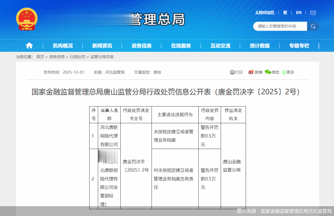 北京商报讯(记者李秀梅)12月1日,国家金融监督管理总局河北监管局发布行政处罚信息显示,河北唐联保险代理有限公司,因未按规定建立或者管理业务档案,被警告并罚款0.5万元;时任河北唐联保险代理有限公司业管部经理宋晓艳,被警告并罚款0.5万元。