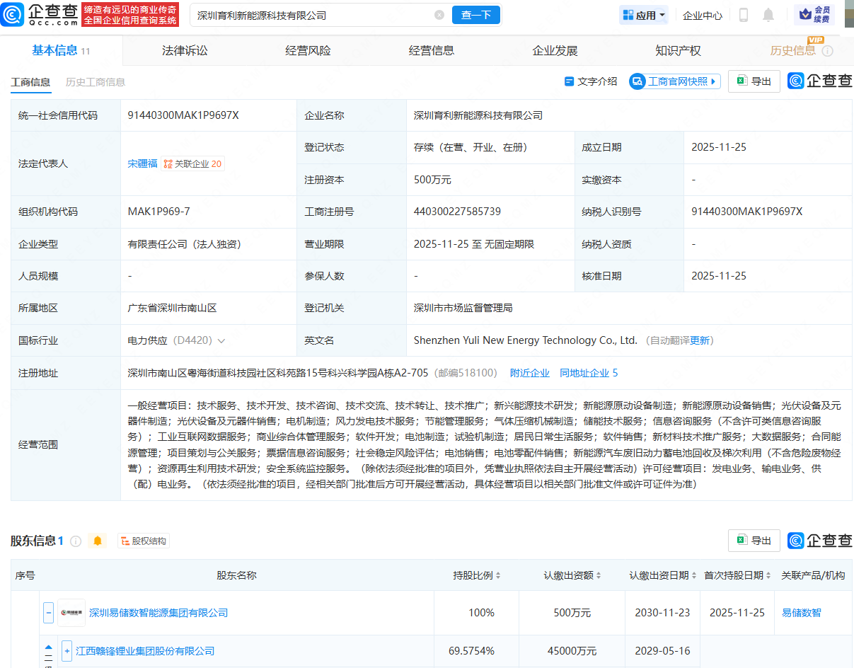 企查查APP显示,近日,深圳育利新能源科技有限公司成立,法定代表人为宋疆福,经营范围包含:新兴能源技术研发;新能源原动设备制造;光伏设备及元器件制造;电机制造;风力发电技术服务等,由赣锋锂业(002460)旗下深圳易储数智能源集团有限公司全资持股。企查查显示,深圳易储数智能源集团有限公司还对外投资成立了深圳观鼎新能源科技有限公司、深圳力献新能源科技有限公司。