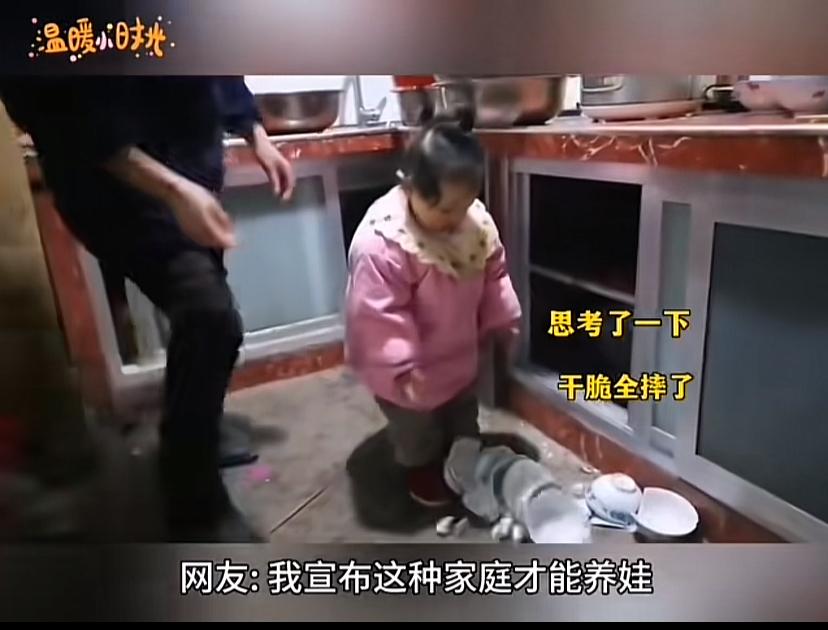 现在的小孩在蜜罐里成长!一小女孩把所有碗都给摔碎,爷爷看见哈哈大笑,还说没事。一