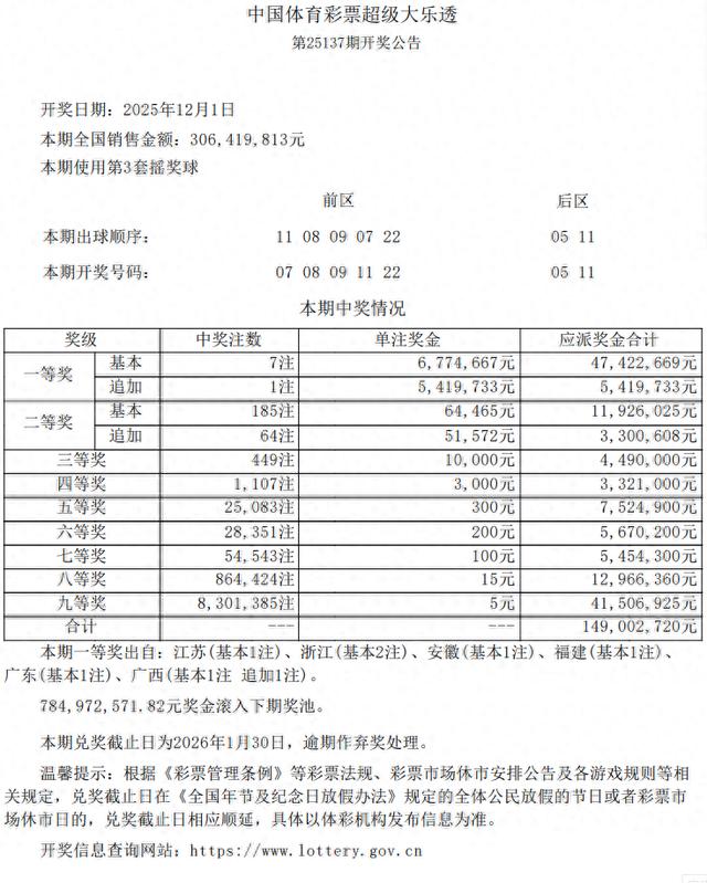 大皖新闻讯12月1日晚,中国体育彩票超级大乐透第25137期开奖公告发布,当期开出7注一等奖。