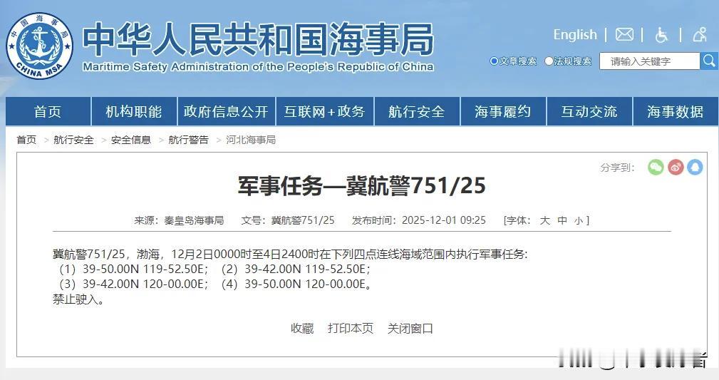 航行警告!渤海部分海域执行军事任务,禁止驶入。据中国海事局网站消息,秦皇岛海事局发布航行警告,12月2日0时至4日24时、12月2日0时至8日24时,渤海部分海域执行军事任务,禁止驶入。 来源:央视新闻客户端。
