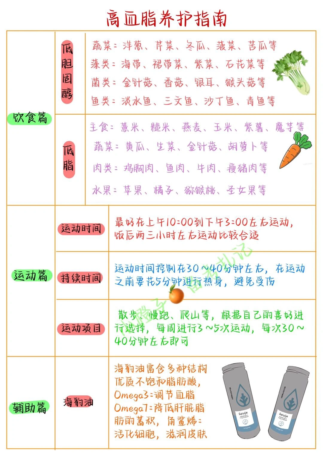 低胆固醇:蔬菜(洋葱、芹菜、冬瓜、菠菜、苦瓜等);藻类(海带、裙带菜、紫菜、石花菜等);菌类(金针菇、香菇、银耳、猴头菇等);鱼类(淡水鱼、三文鱼、沙丁鱼、青鱼等)