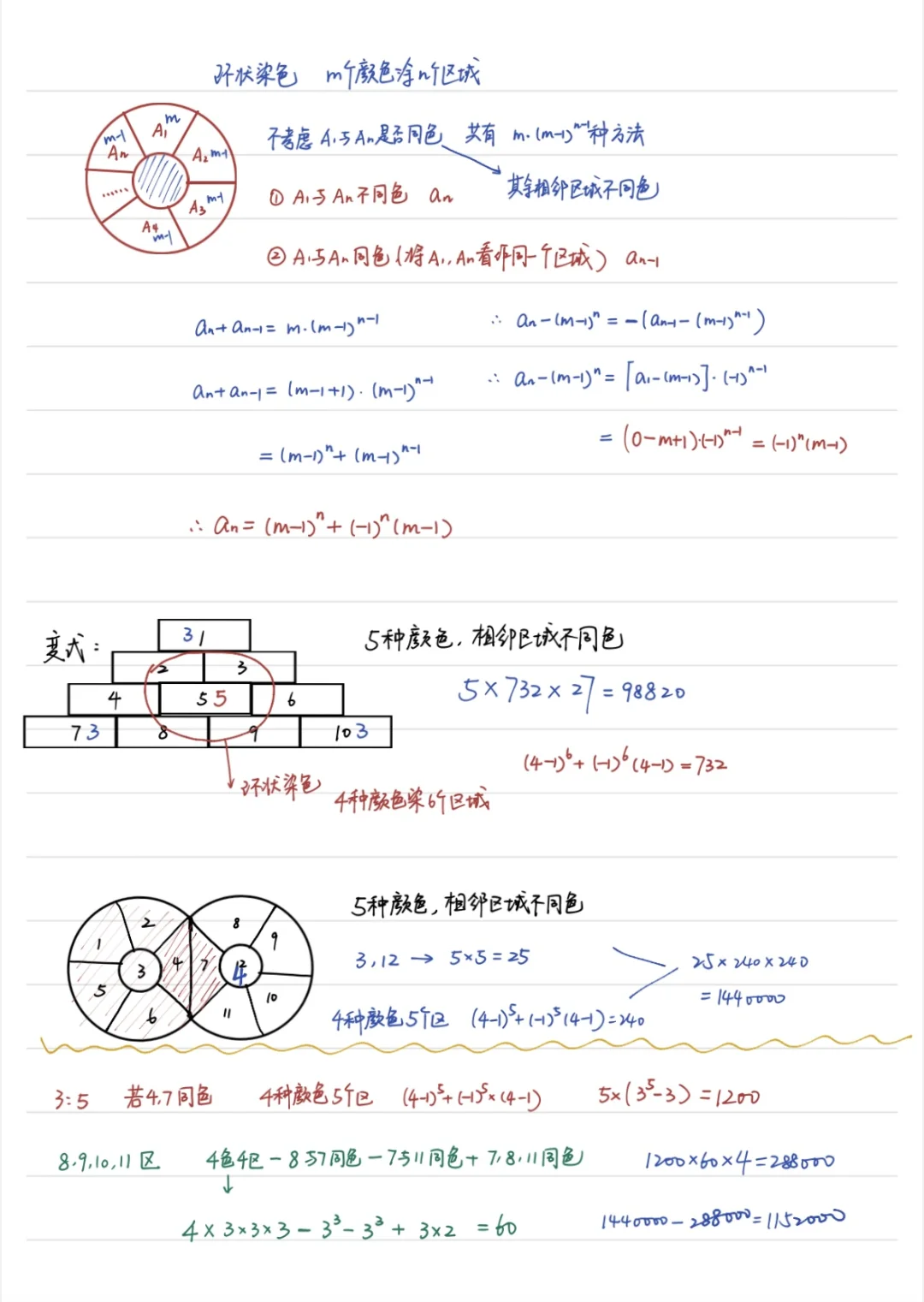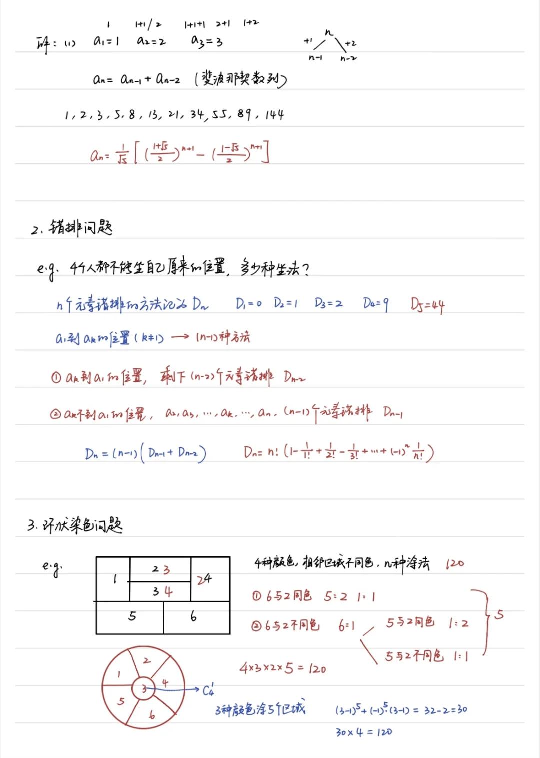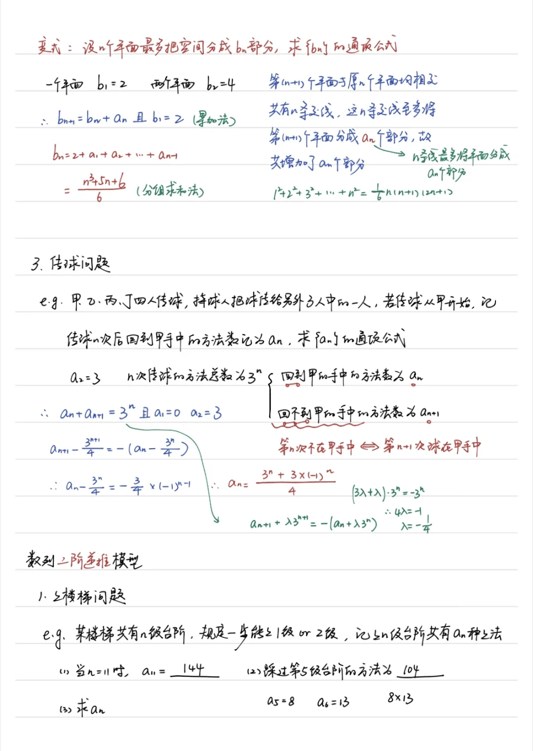 这个专题还是打算花时间给学生讲,毕竟和数列紧密联系在了一起,也挺有意思的。 今早我提了一下错排问题,好像讲的不那么清楚,明天用这个专题重新讲。 排列组合真的要多讲,凡是花时间讲了的题,学生明显做的好一些了。 这个专题我分成了一阶递推和二阶递推进行总结,一阶递推包括了汉诺塔模型、分空间和传球问题;二阶递推包括了爬楼梯问题、错排问题和环状染色问题;用心总结的,分享给大家!