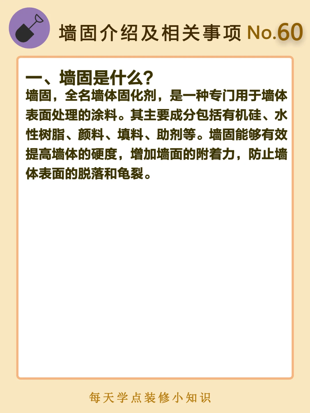 墙固,全名墙体固化剂,是一种专门用于墙体表面处理的涂料。其主要成分包括有机硅、水性树脂、颜料、填料、助剂等。墙固能够有效提高墙体的硬度,增加墙面的附着力,防止墙体表面的脱落和龟裂。