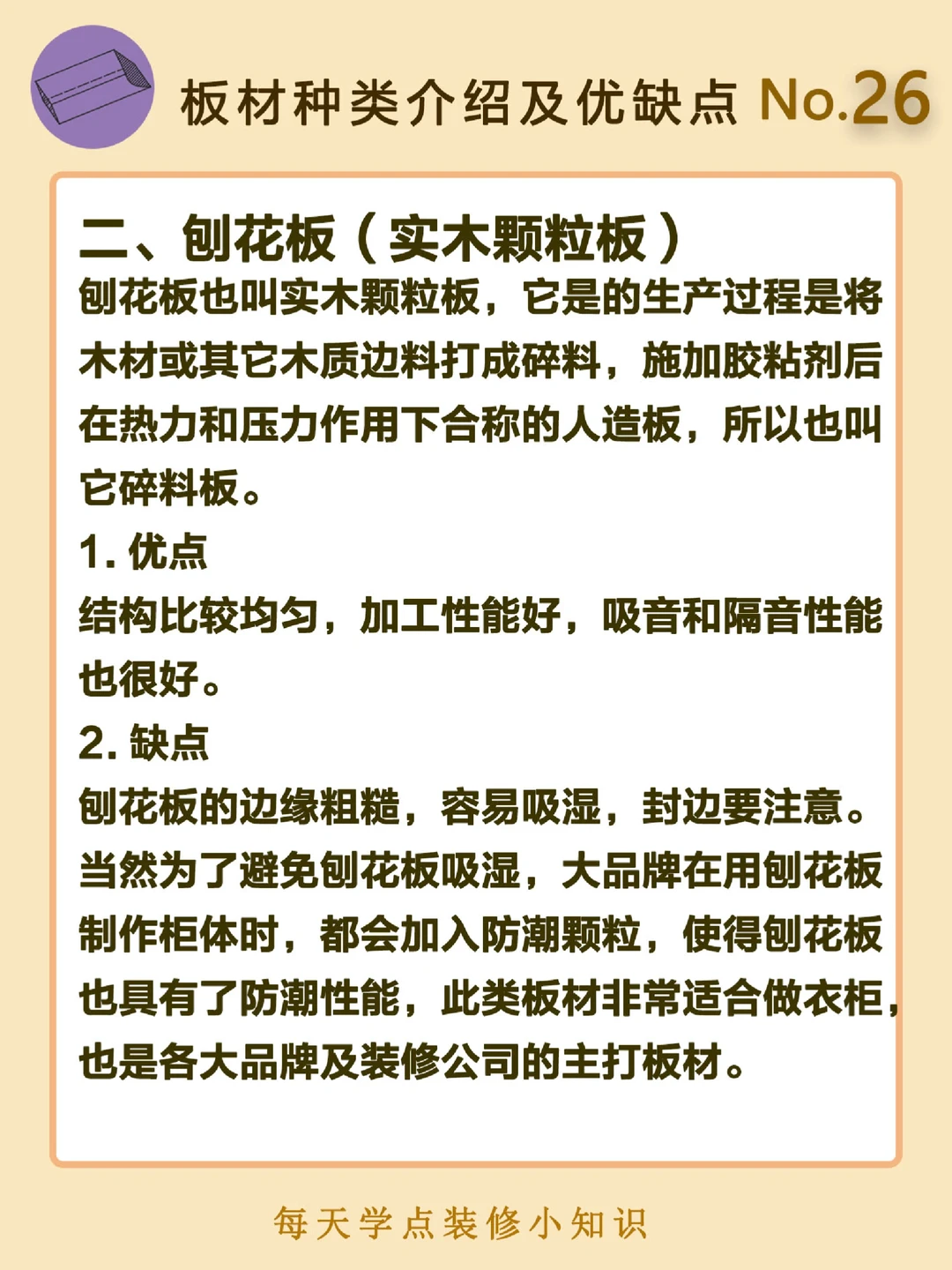 缺点是:刨花板的边缘粗糙,容易吸湿,封边要注意。刨花板具有防潮性能,此类板材非常适合做衣柜,也是各大品牌及装修公司的主打板材。
