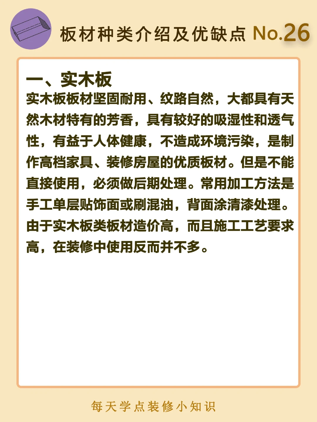 坚固耐用、纹路自然,具有天然木材特有的芳香,具有较好的吸湿性和透气性,有益于人体健康,不造成环境污染,是制作高档家具、装修房屋的优质板材。但是不能直接使用,必须做后期处理。常用加工方法是手工单层贴饰面或刷混油,背面涂清漆处理。由于实木板类板材造价高,而且施工工艺要求高,在装修中使用反而并不多。