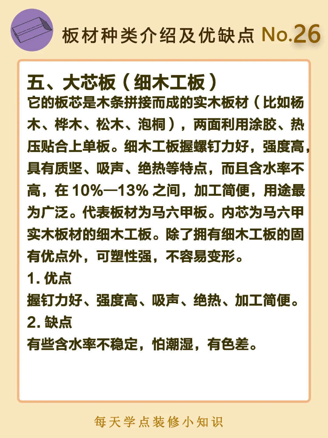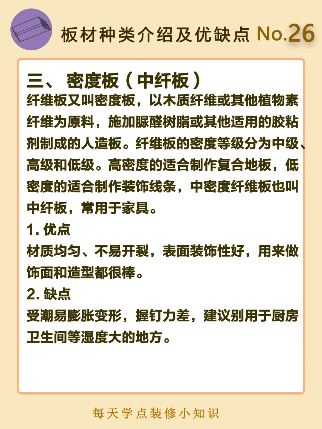缺点:受潮易膨胀变形,握钉力差,建议别用于厨房卫生间等湿度大的地方。