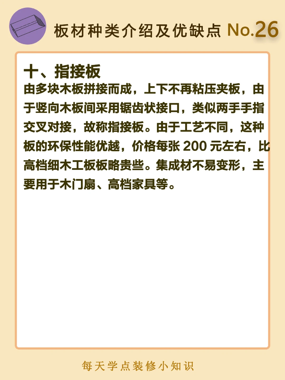 由于工艺不同,这种板的环保性能优越,价格每张200元左右,比高档细木工板板略贵些。集成材不易变形,主要用于木门扇、高档家具等。
