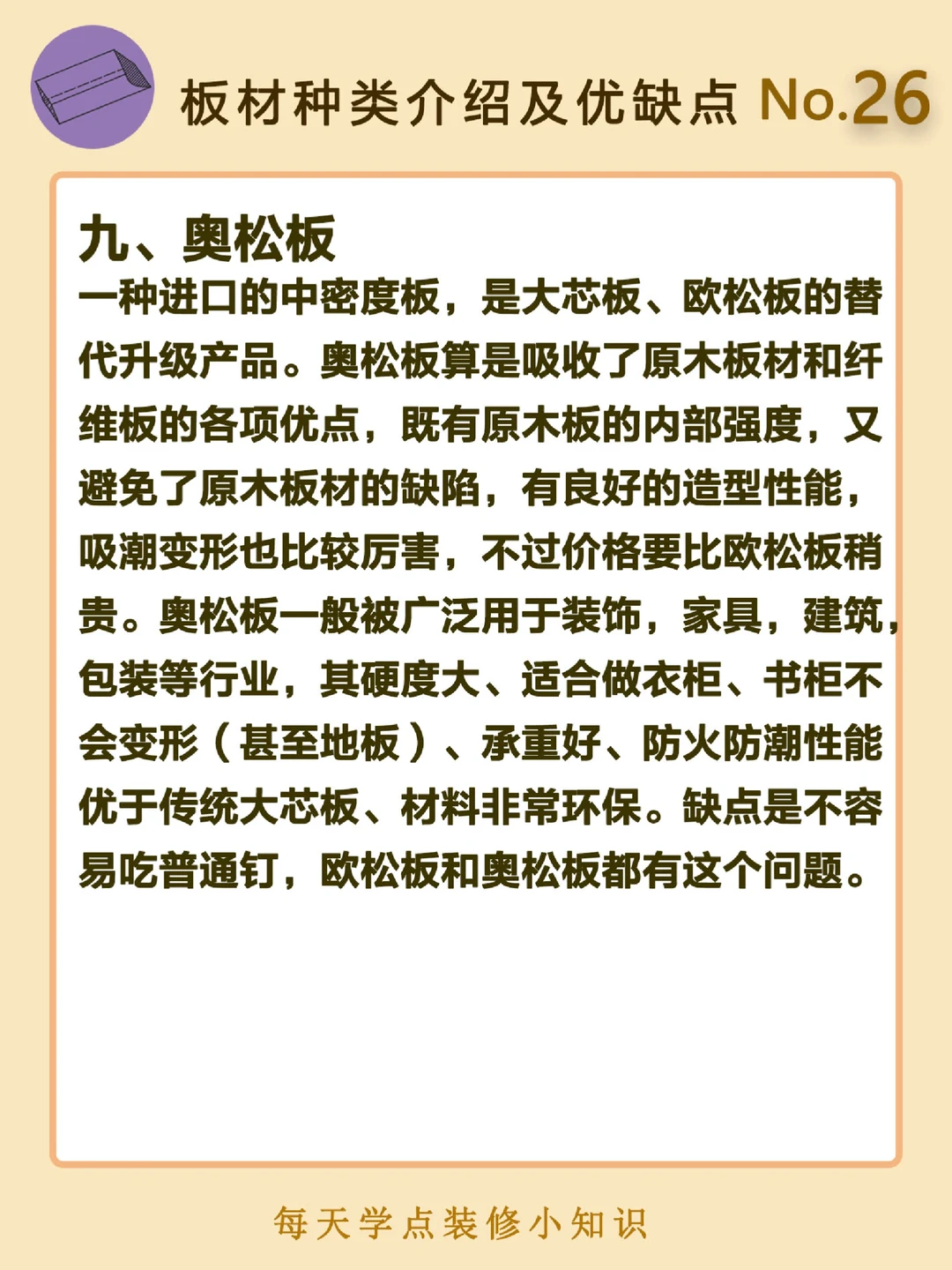 吸收了原木板材和纤维板的各项优点,既有原木板的内部强度,又避免了原木板材的缺陷,有良好的造型性能,吸潮变形也比较厉害,不过价格要比欧松板稍贵。其硬度大、适合做衣柜、书柜不会变形、承重好、防火防潮性能优于传统大芯板、材料非常环保。缺点是不容易吃普通钉,欧松板和奥松板都有这个问题。