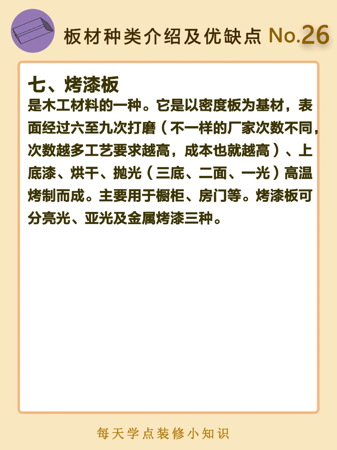 是木工材料的一种。它是以密度板为基材,表面经过六至九次打磨(不一样的厂家次数不同,次数越多工艺要求越高,成本也就越高)、上底漆、烘干、抛光高温烤制而成。主要用于橱柜、房门等。