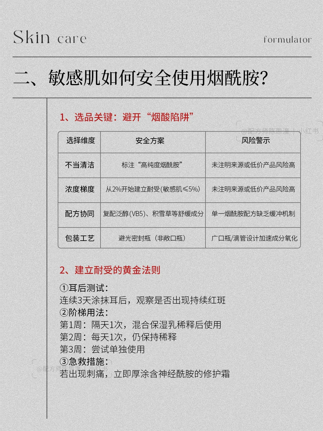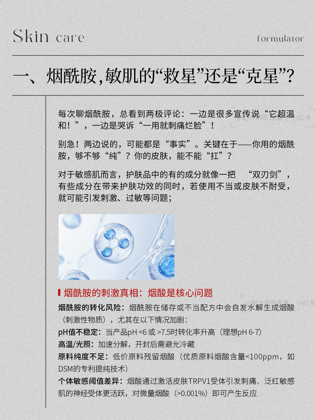 其实只要做好 严控烟酸残留、稳定配方 pH 值、科学复配舒缓成分 这三点,敏肌也能安心享受烟酰胺的美白、修护、控油全能功效!