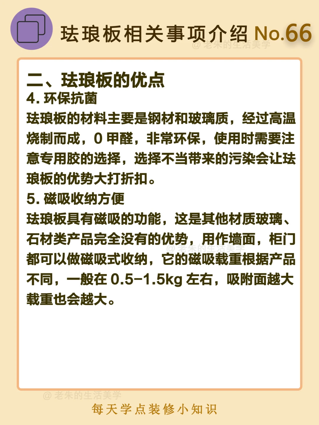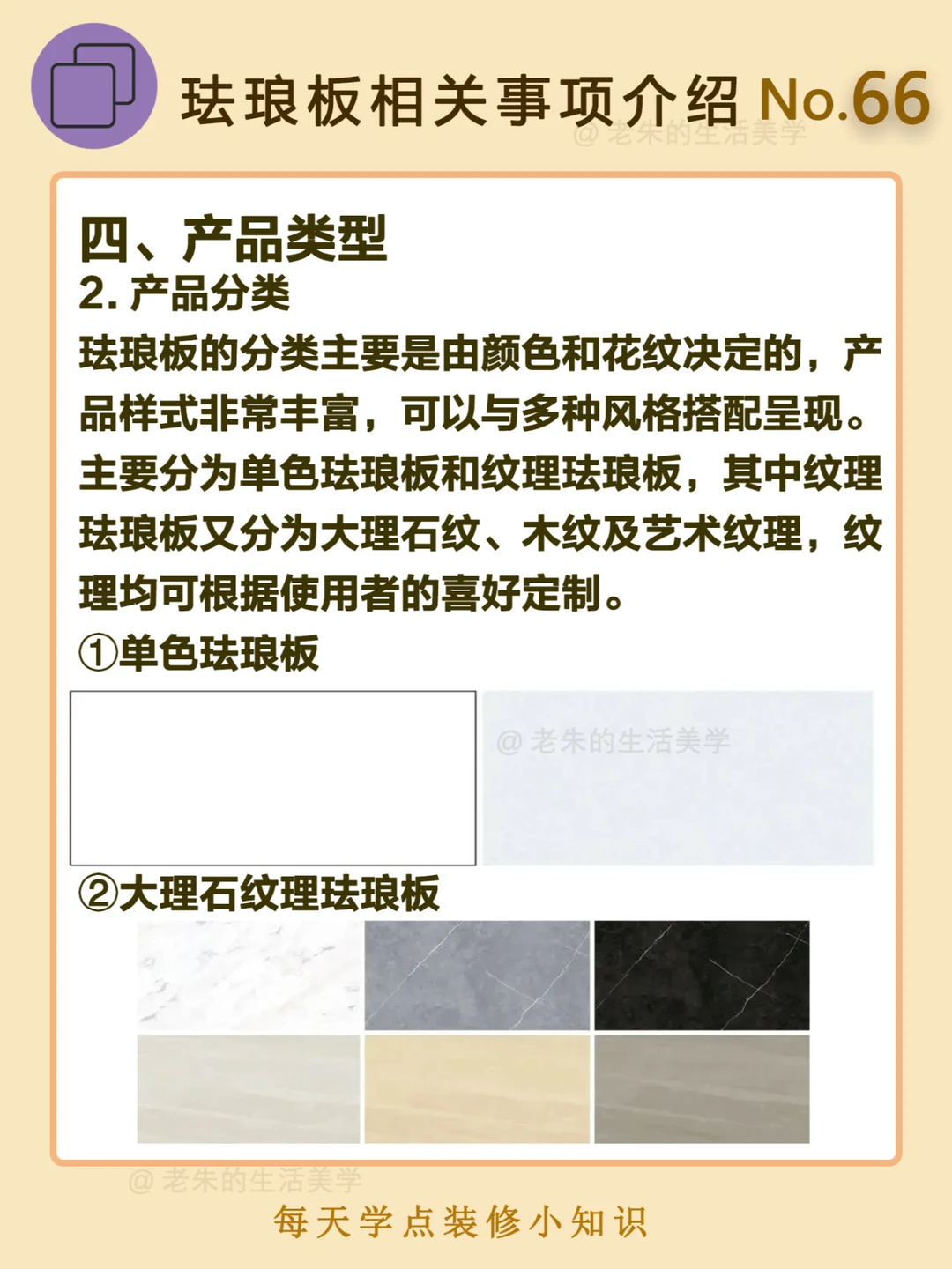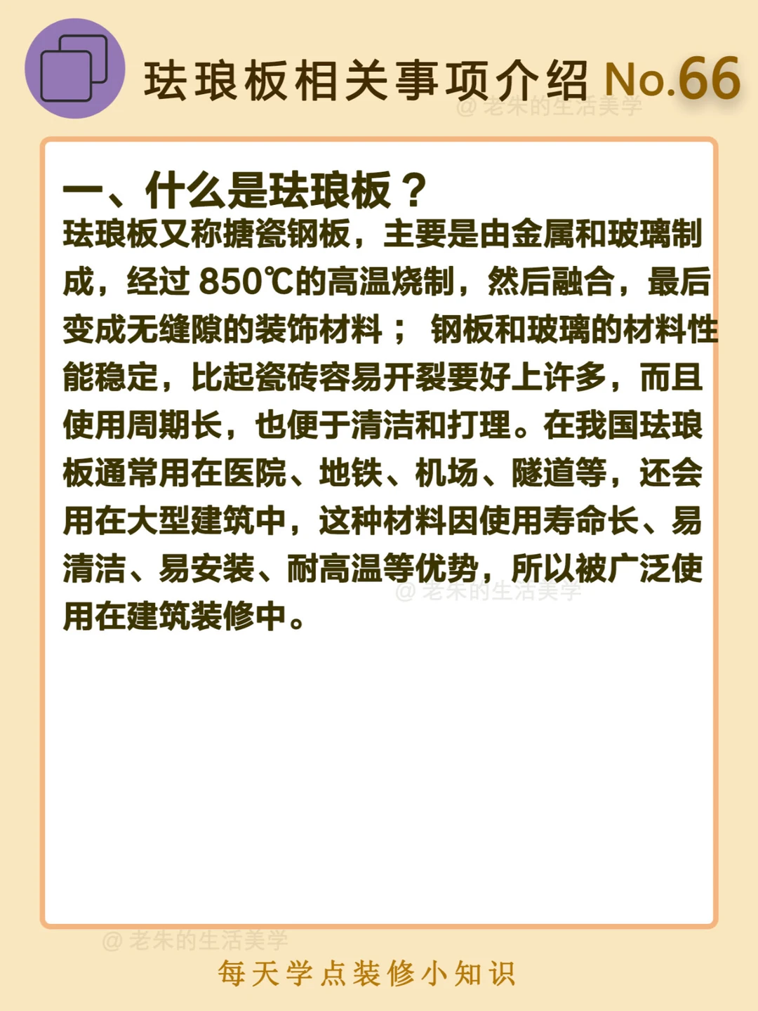 🔔 一、什么是珐琅板? 珐琅板又称搪瓷钢板,主要是由金属和玻璃制成,经过850℃的高温烧制,然后融合,最后变成无缝隙的装饰材料;钢板和玻璃的材料性能稳定,比起瓷砖容易开裂要好上许多,而且使用周期长,也便于清洁和打理。 二、珐琅板的优点 三、珐琅板的缺点 四、产品类型 🔆 我是老朱 📍坐标天津 前上市公司金牌工长🏅 30年施工经验🛠️ 承接天津新房装修/老房改造 精心整理关于设计&施工&装修的攻略📝 关注我每日更新🗓️ 也可以在评论区留下您宝贵的想法与建议💓 让您装修不走弯路✅