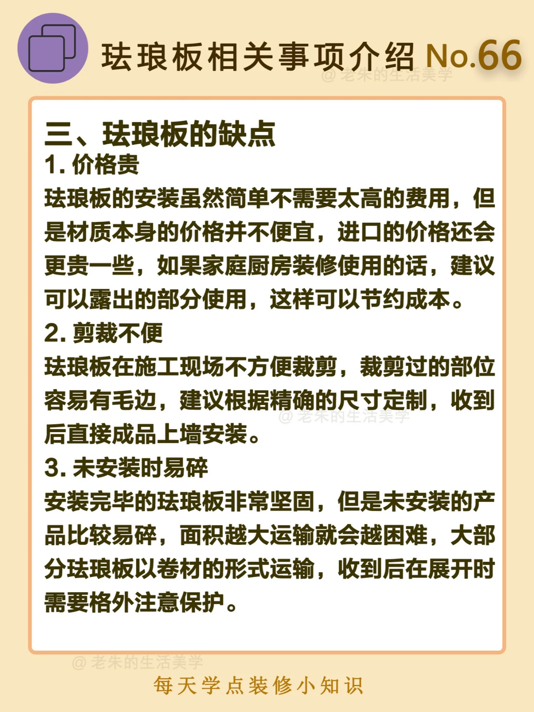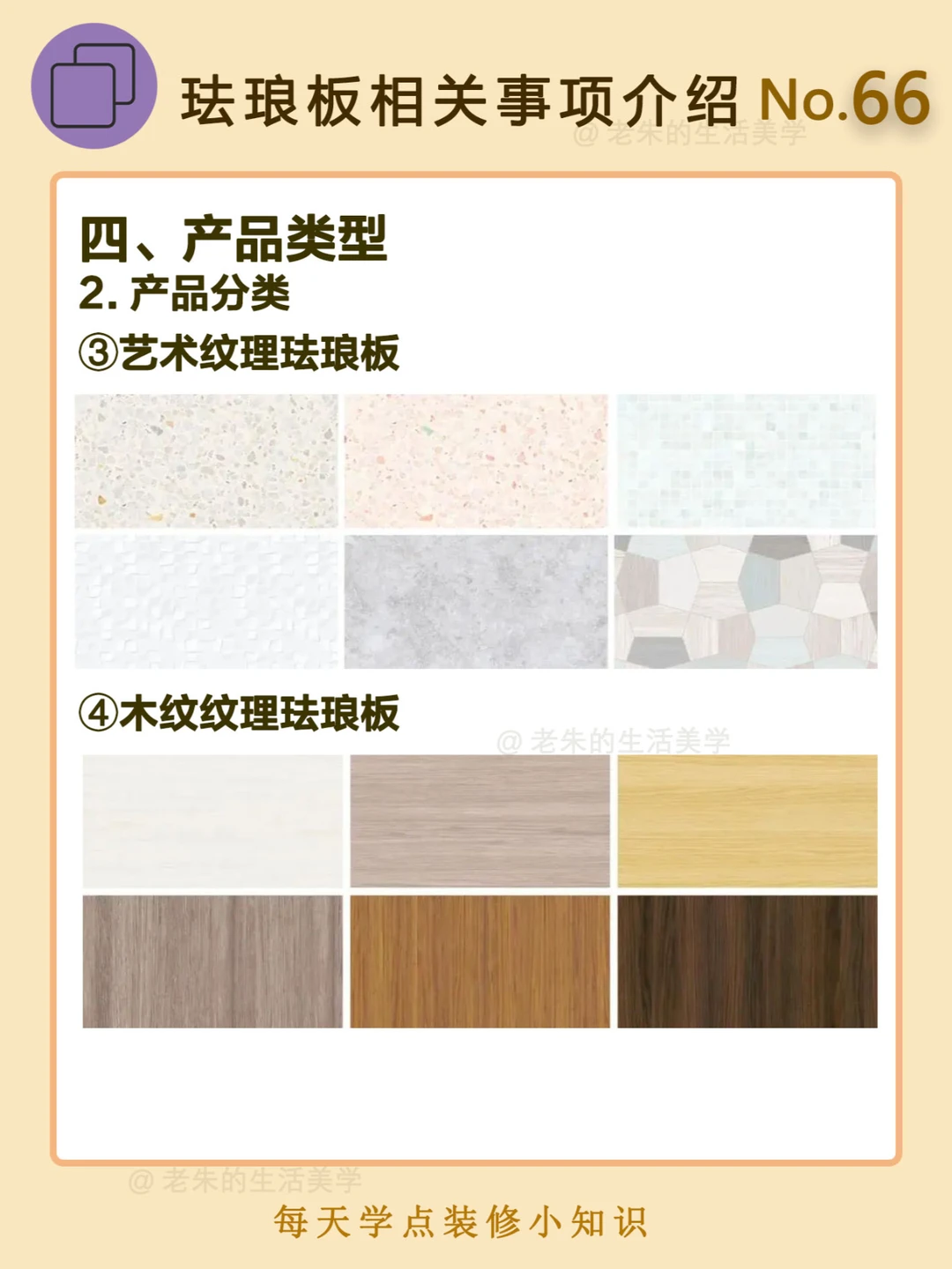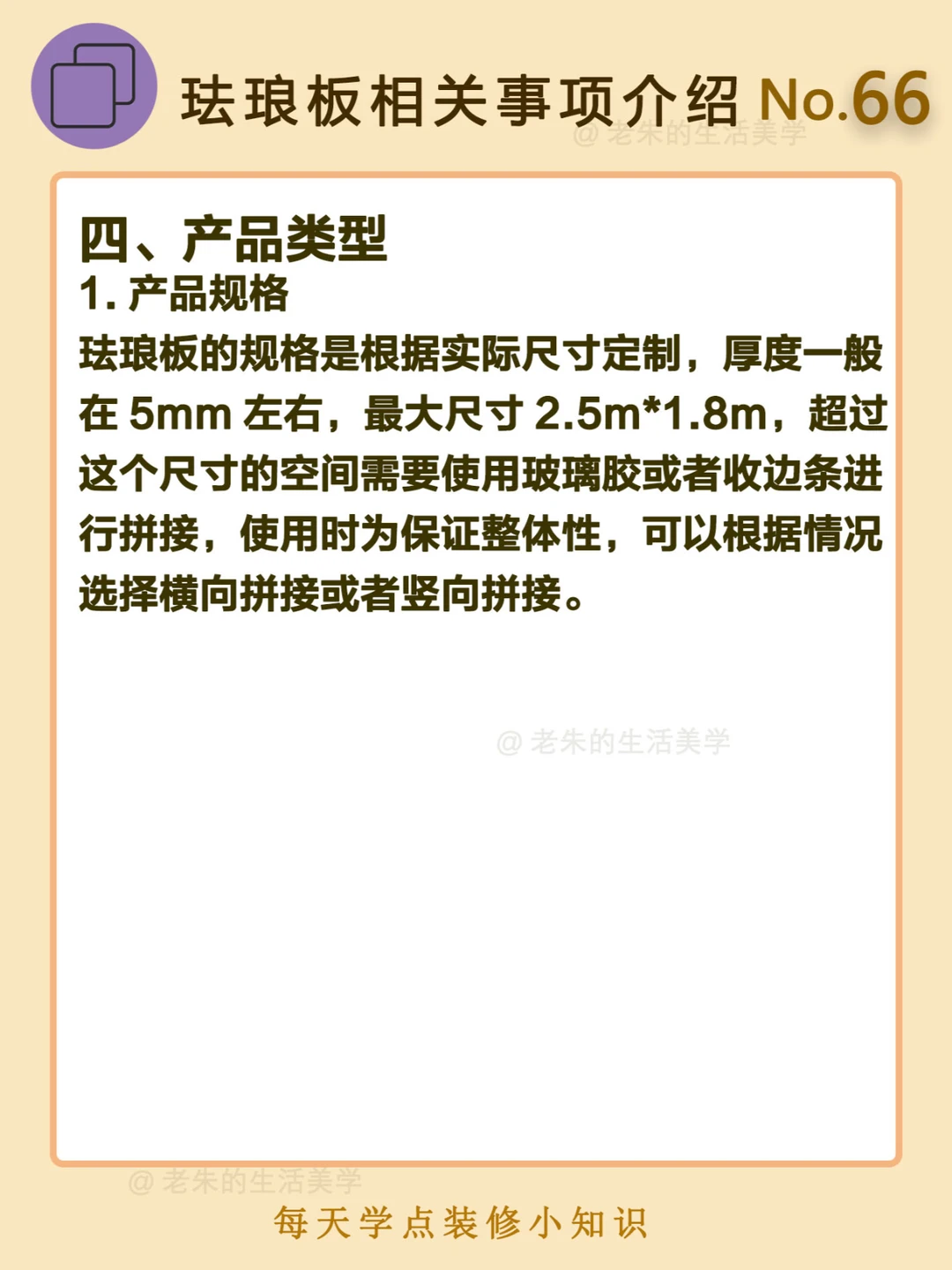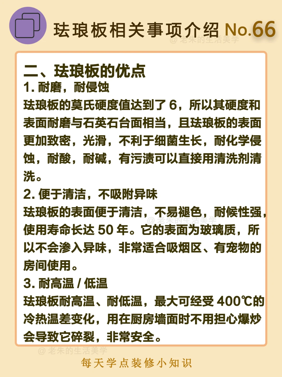 🔔 一、什么是珐琅板? 珐琅板又称搪瓷钢板,主要是由金属和玻璃制成,经过850℃的高温烧制,然后融合,最后变成无缝隙的装饰材料;钢板和玻璃的材料性能稳定,比起瓷砖容易开裂要好上许多,而且使用周期长,也便于清洁和打理。 二、珐琅板的优点 三、珐琅板的缺点 四、产品类型 🔆 我是老朱 📍坐标天津 前上市公司金牌工长🏅 30年施工经验🛠️ 承接天津新房装修/老房改造 精心整理关于设计&施工&装修的攻略📝 关注我每日更新🗓️ 也可以在评论区留下您宝贵的想法与建议💓 让您装修不走弯路✅
