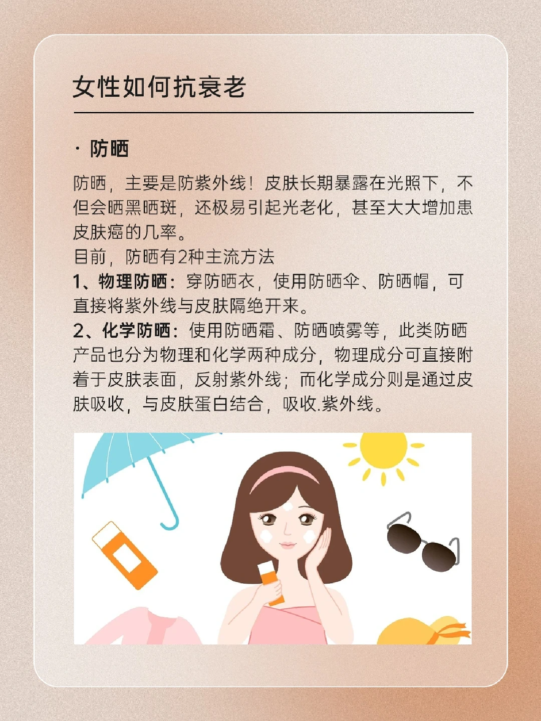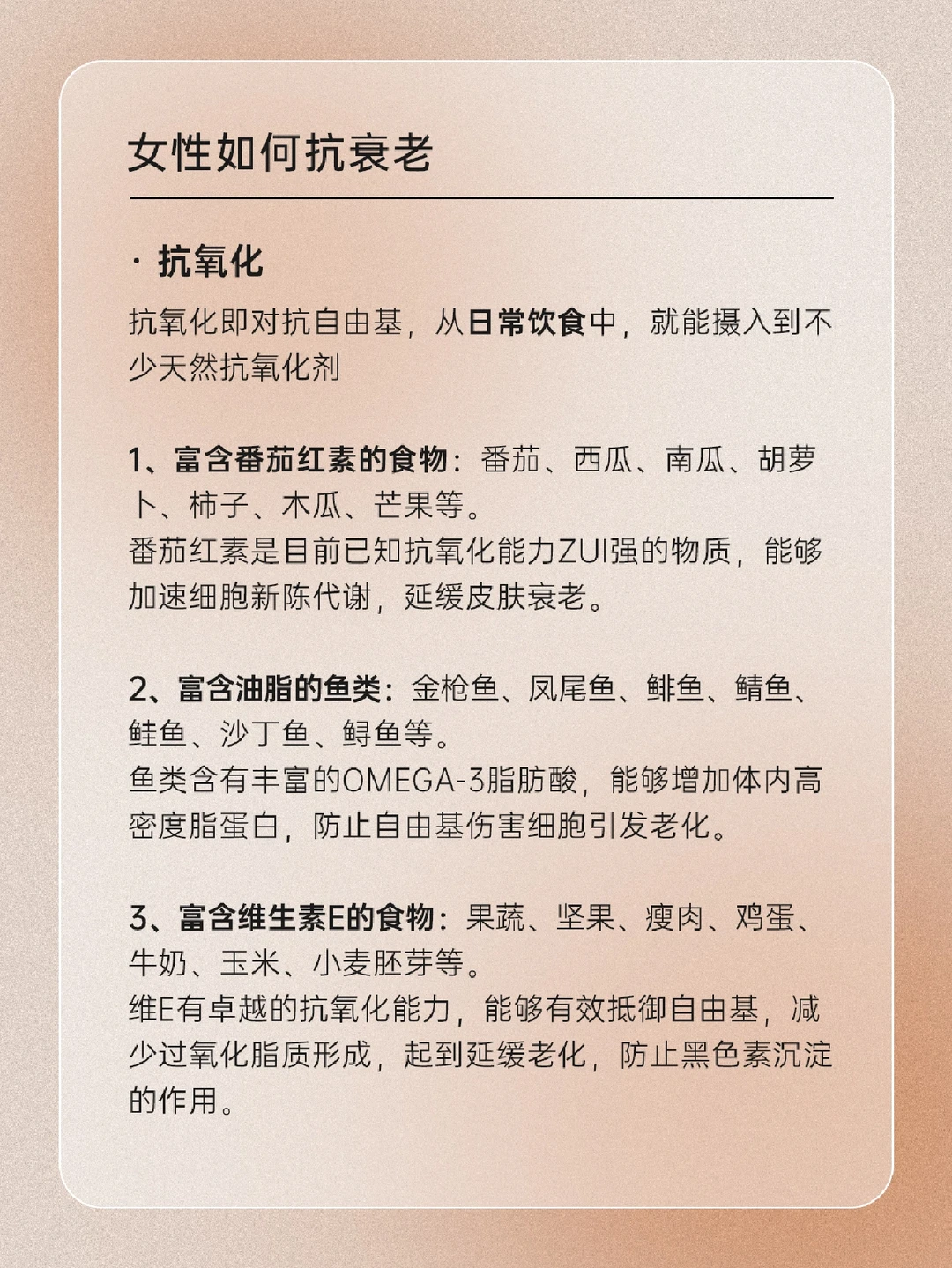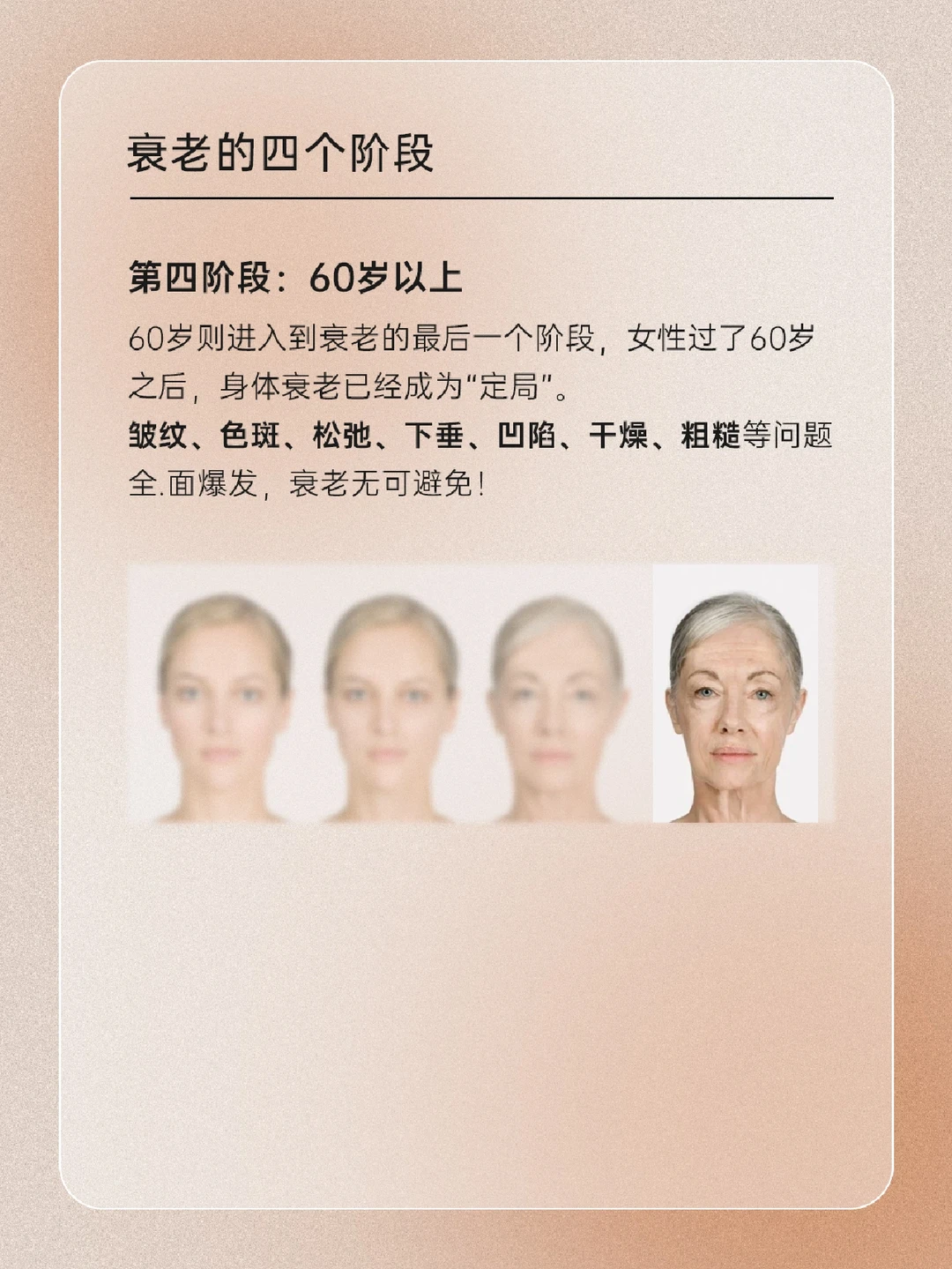 💫 衰老的四个阶段 • 第yi阶段:25岁~35岁 • 第二阶段:35岁~45岁 • 第三阶段:45岁~60岁 • 第四阶段:60岁以上 💫 女性如何抗衰老 • 防晒 • 抗氧化 • 控糖 一起来了解一下吧,下期还想看什么可以❤➕🍎告诉我哦
