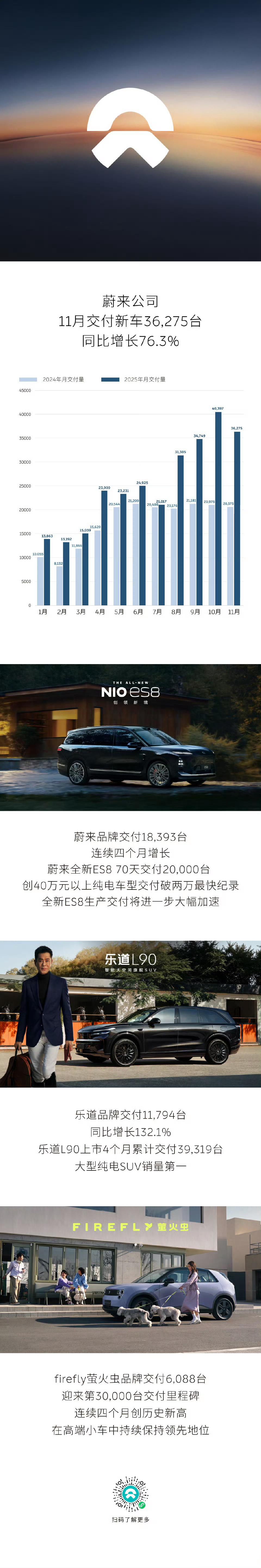 小鹏11月交付36728辆(7各车型,纯电和增程算一个)恭喜鹏友恭喜蔚来交付了36275台(11个车型)=蔚来18393(8个车型)+乐道11794(2各车型)+萤火虫6088(1个车型))萤火虫交付能到6000+/月实在惊讶不已7月以来销量陡增理想33181台(7个车型)三位新能源老将都被新人小米以40000+(仅两个车型)的交付量拍在沙滩上