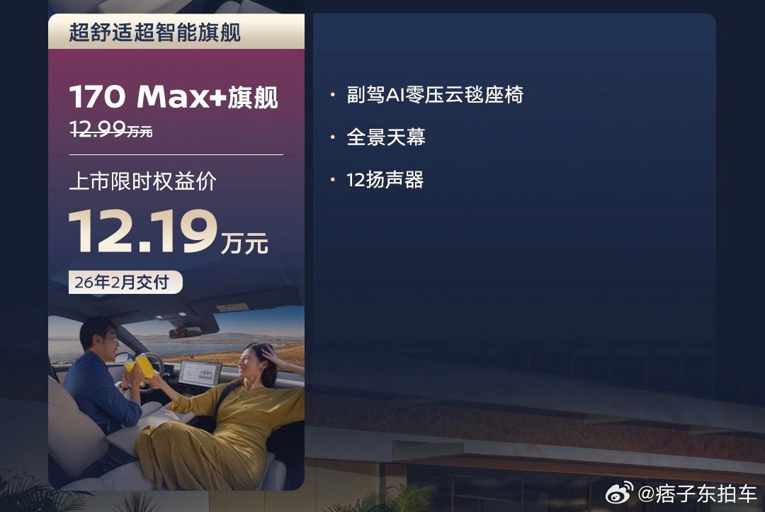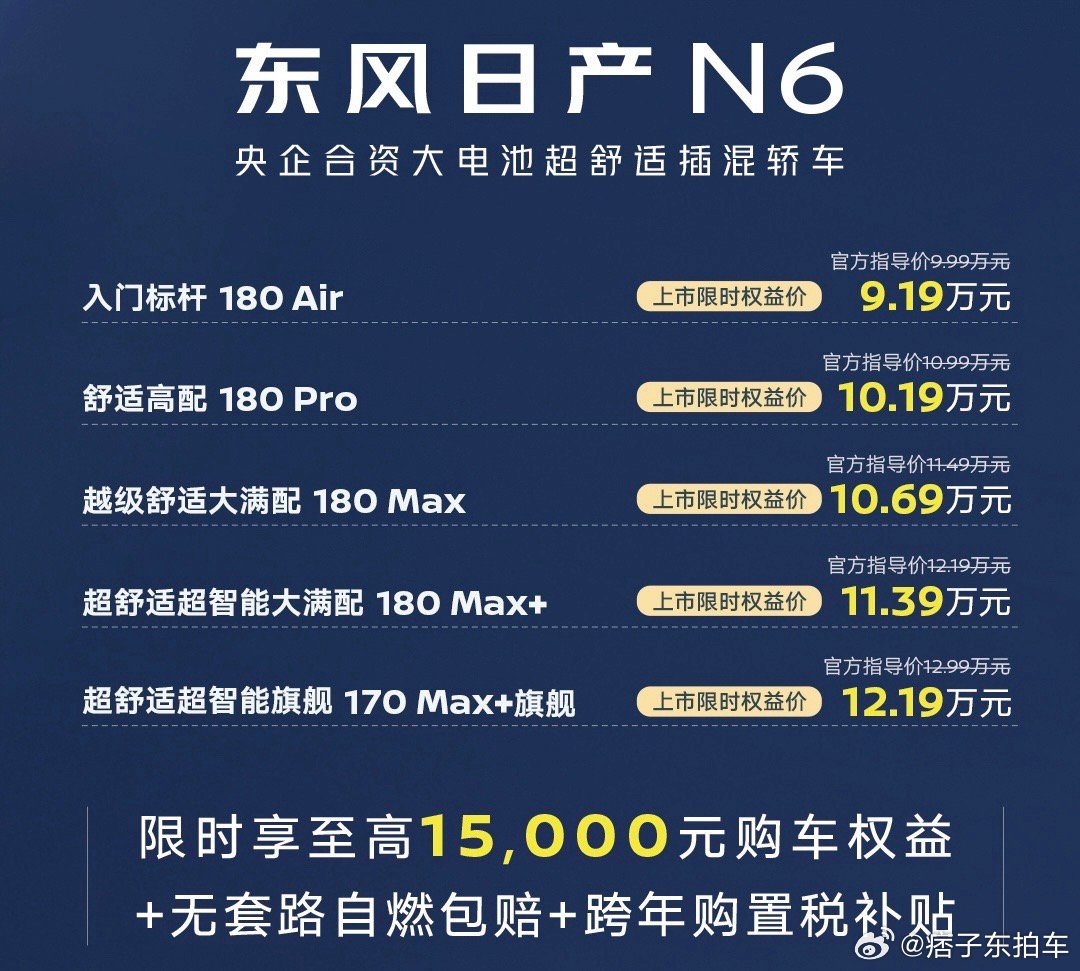 东风日产N6的价格来啦,9.19万起,12.19万封顶,特别特别好价啊!作为一款插混中型车,N6的空间和能耗都非常ok了,那大家最关注的配置呢,在合资车里算是给的非常全面了,甚至还有个我先前都不知道的170MAX+旗舰版,12万元不仅配了全景天窗,副驾也有AI云毯座椅,实在疯狂如果你能等,选择明年2月交付的旗舰版,如果你等不及,那就180MAX,现在顶配超值大电池超舒适插混N6售9.19万起东风日产N6央企合资插混N6上市9.19万起