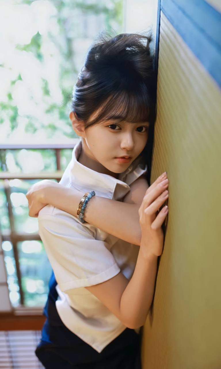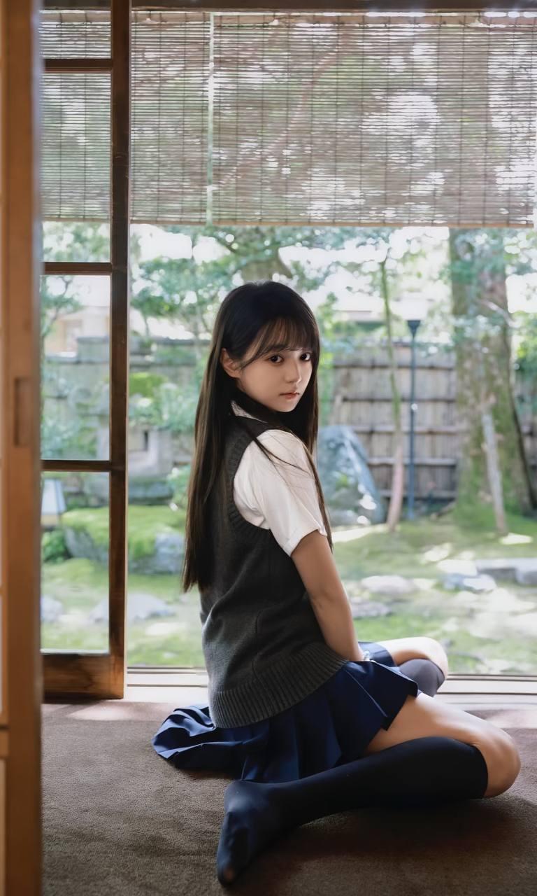 少女静坐榻榻米窗外绿意盎然美少女 分享美少女倩影 窗边静谧写真